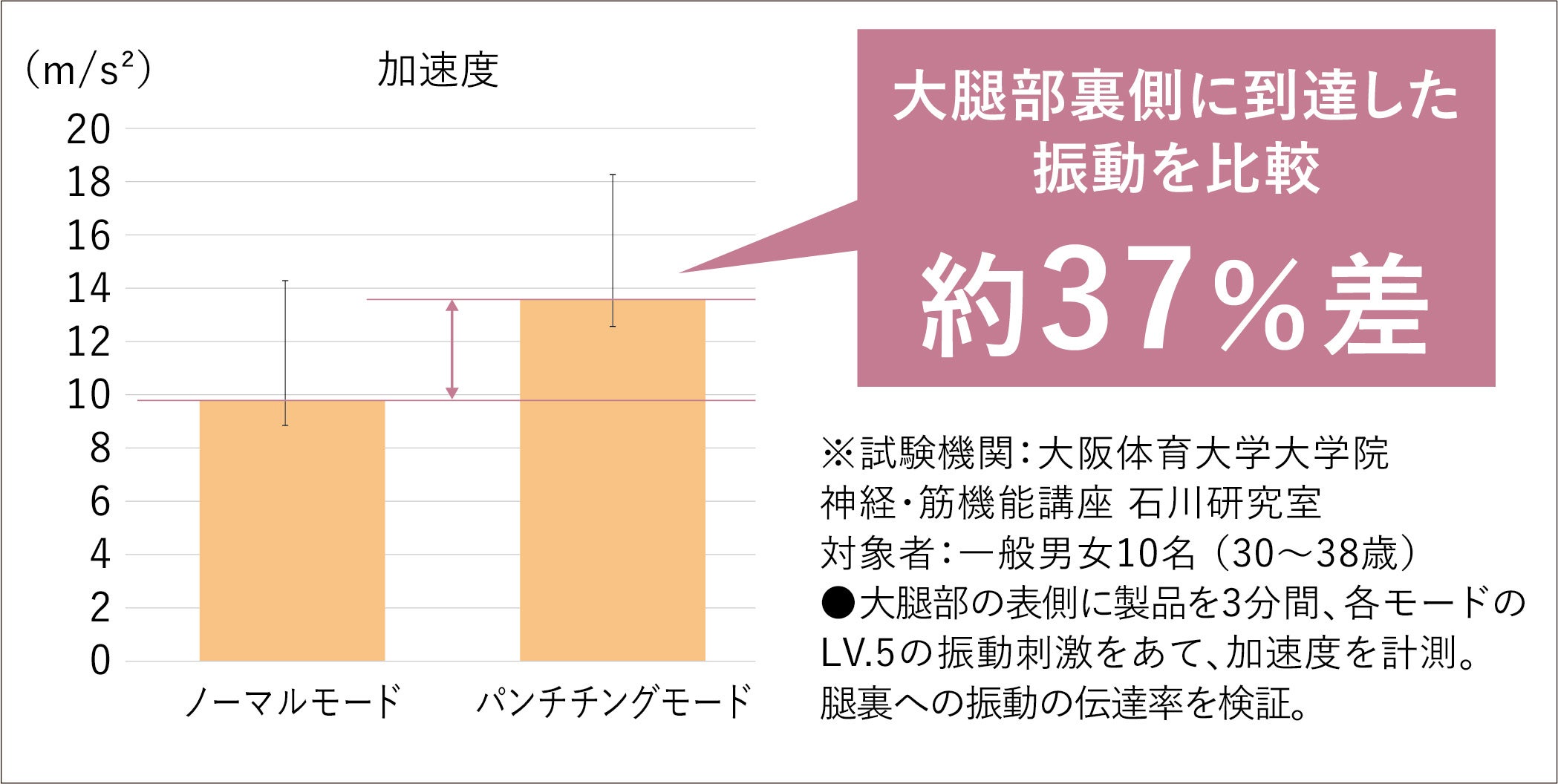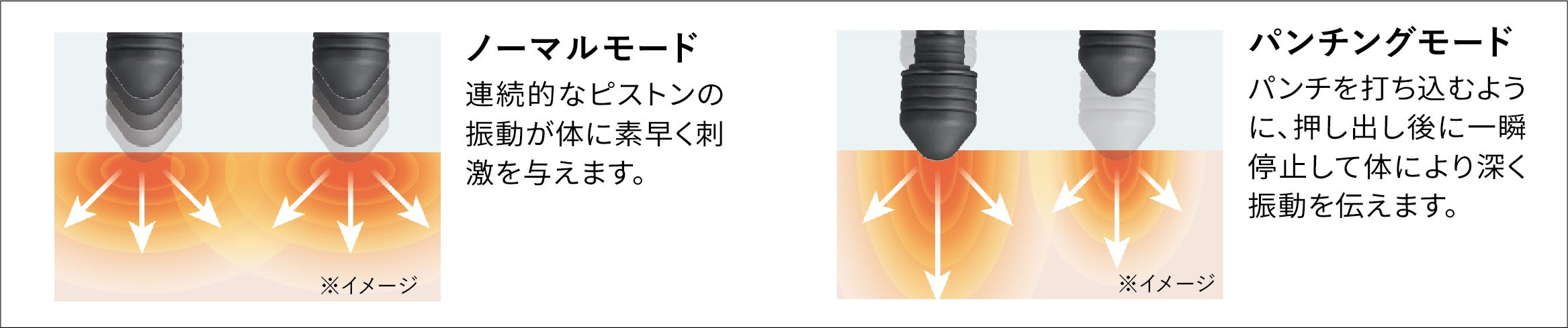 2種類の振動モードを搭載し、すきま時間の集中ケアや運動後のケアなど、状況に応じて使い分けができます。パンチングモードではノーマルモードと比べて、約37%多くの振動を届けます。運動後や深部のケアしたい時におすすめです。
