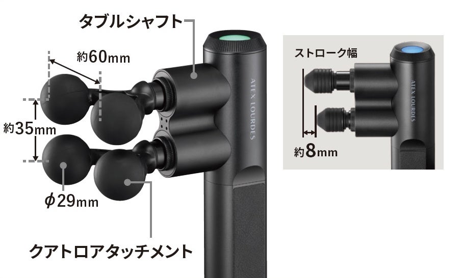 アタッチメントに4つの球が付いたボディケアガンです。ダブルシャフト(2軸)が交互に動き、シリーズ最大※1約8mmのストロークで筋肉を効率的に刺激します。さらに、クアトロアタッチメントの4つの球が、少ない振動数で効率的なボディケアを可能にしました。
