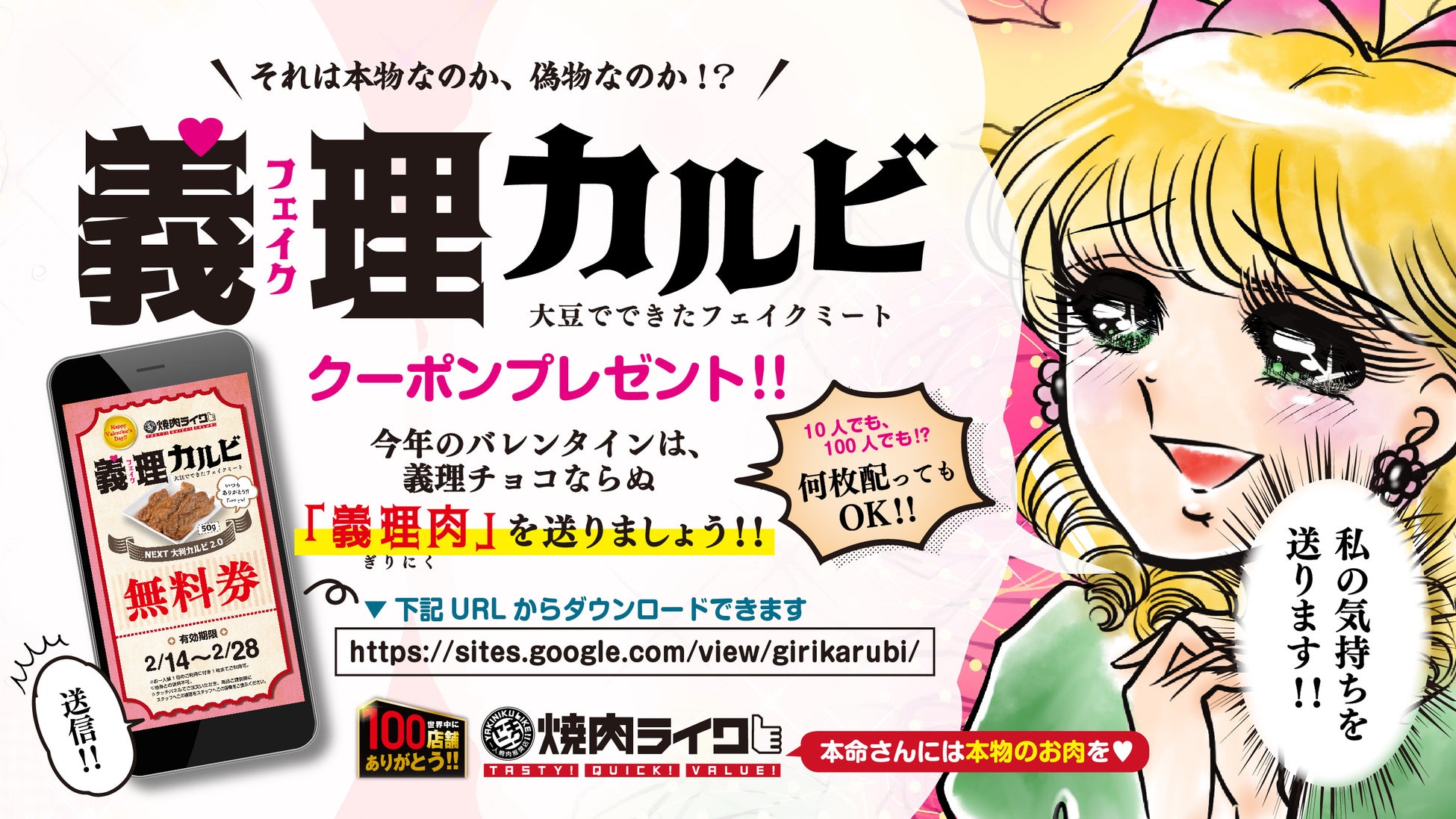株式会社焼肉ライク(所在地:東京都渋谷区、代表者 有村 壮央)が運営する焼肉のファストフードをコンセプトにした「焼肉ライク」は2月14日(月)から『バレンタイン「義理カルビ」プレゼントキャンペーン』を全店舗で開催。義理チョコを贈った方がいいのか、何を送ればいいのか、いつ渡した方がいいのかなど、義理チョコに悩んでいる方々を救済すべく、焼肉ライクから「義理カルビ=代替肉」を提案・プレゼントします。また、クーポンで送れる為、テレワークや直接手渡しができない方にもピッタリです。本物(本気)じゃない、けどちゃんと美味しい「NEXT大判カルビ2.0」は日頃の感謝もしっかり伝わりながら、他にはない、ユニークなプレゼントになること間違いなし!ぜひ、バレンタインも焼肉も気軽に楽しんでください。