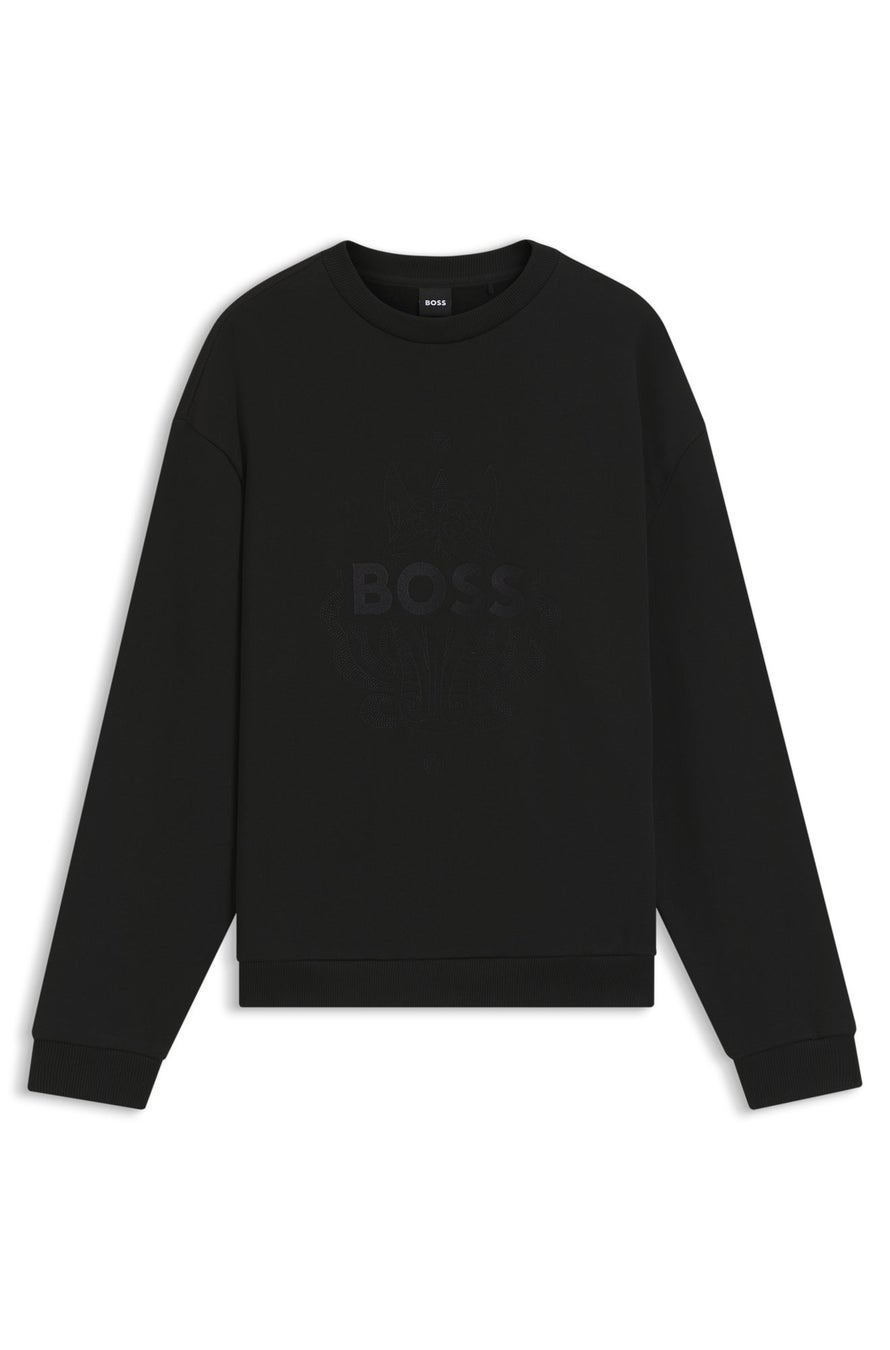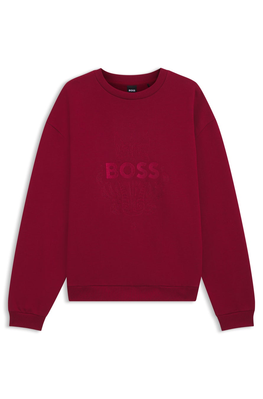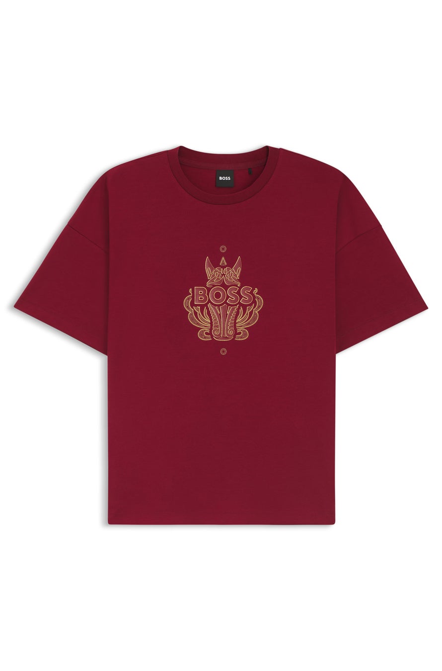 本コレクションはジャケット、ニットウェア、スウェットシャツ、Tシャツ、ポロシャツ、デニムに加え、メンズアンダーウェアやソックスまで、特徴的なパターンや総柄プリントを施し、古典的金工芸の魅力を表現。レッド、ホワイト、ブラックを基調としたカラーパレットにゴールドのラインをアクセントとして配し、金彩のコントラストが、華やかな伝統美と現代的スタイルの均衡を際立たせます。コレクションの主役となるのは、伝統的な追金技法による彫刻的レリーフ表現を、レーザーカットで現代的に再解釈したジップアップレザージャケット。豊かなラグジュアリーを象徴する、存在感あふれる一着です。このデザイン言語は、ジャカードダウンベスト、ベルベットジャカードセーター、レーザープリントデニムへと広がり、ヘリテージクラフツマンシップを革新的に解釈するBOSSの姿勢を映し出します。フーディーやスウェットシャツには、プリントと刺繍を重ねた精緻なレイヤードパターンを採用し、フィリグリー技法へのオマージュを表現。一方で、ゴールドトーンのビーズディテールは粒金装飾の美を想起させます。さらに各アイテムには中国に着想を得た名称を与え、東洋のエレガンスを漂わせながら、文化的レガシーを日常の装いへと織り込んでいます。