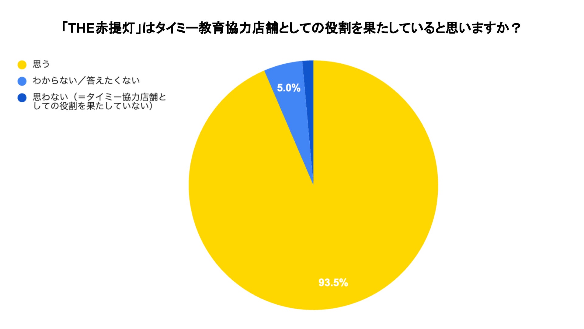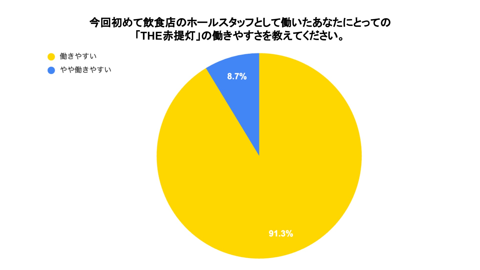 はじめて飲食店のホールスタッフとして働いたワーカーに対して「THE 赤提灯」の働きやすさを4段階評価で問うと、回答者の91.3%が最高評価の「働きやすい」と回答。「やや働きやすい」を含めると、回答者の全員が「働きやすい」と評価しています。また、「教育協力店舗としての役割を果たしていると思うか」という質問には、全体の93.5%が「思う」と回答しました。