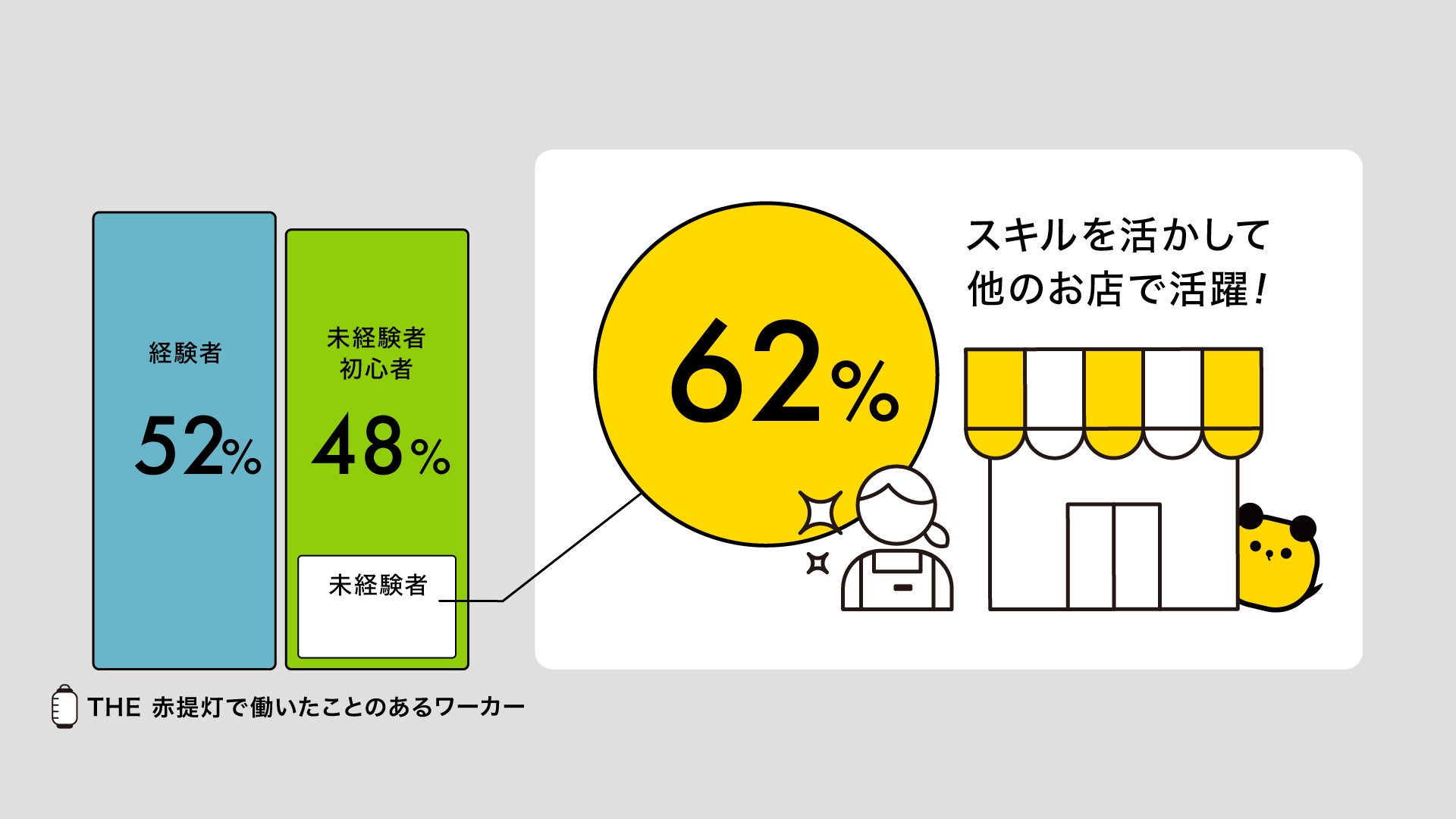 「THE 赤提灯」で開店後半年の間に働いたことのあるワーカーは、約250名(※1)です。そのうち、約52%が飲食経験者、約48%が初心者・未経験者でした(※2)。さらに、これまで飲食店での勤務経験がなく「THE 赤提灯」ではじめて飲食業で働いた方が全体の約17%で、これら未経験者のうち、「THE 赤提灯」での勤務経験を活かし、他の飲食店でも「タイミー」を通じて働いたワーカーは、約62%でした。