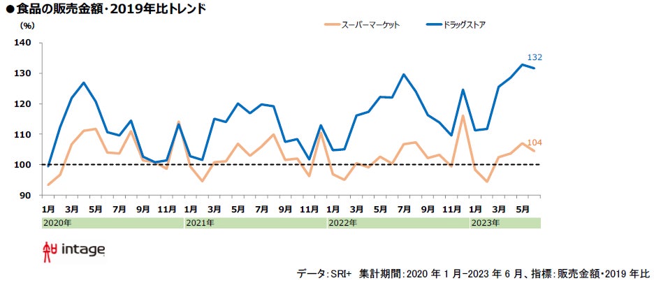 個人の意識・行動では昨年12月に比べて、節約志向がやや弱まる結果となりました。その一方で生活者がものを買う業態の変化は目立ってきました。食品を買う場所と言えば、まずスーパーマーケットを頭に浮かべる人が多いのではないかと思いますが、そこに割って入ってきているのがドラッグストアです。大手や大型店舗が多く、食品以外の商品で高い利益が得られるため、価格面での強みが発揮しやすい業態とも言えます。2019年の月平均と比べ、両業態ともコロナ禍の巣ごもり需要などもあり100%を超える月が多く見られますが、値上げが本格化してきた2022年以降は、食品の販売金額でもドラッグストアの伸び率がスーパーマーケットを大きく上回っていることが見て取れます(図表3)。今年6月はスーパーマーケットが104%に対し、ドラッグストアは132%となっていました。