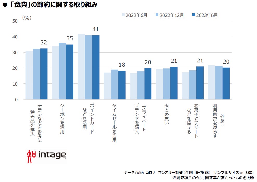 値上げが止まらない中、生活者はどのような方法で対応しているのでしょうか?(図表2)。ここで出てきたのが、1つの変化でした。昨年6月と同12月を比べると特売品やクーポン、タイムセールを利用など、食費節約の工夫をするという人の割合が軒並み増えていました。ただ今年6月のデータを見ると半年前から横ばい、または数字を落としている項目が増えてきました。プライベートブランドの購入やまとめ買いなど、伸びている項目もありますが、「外食の利用回数を減らす」が減少するなど生活者に節約疲れが起きている可能性があります。ただ、それでもポイントカード利用は41%、クーポン利用35%、特売品購入が32%など多くの人が節約行動に出ていることは変わっていません。
