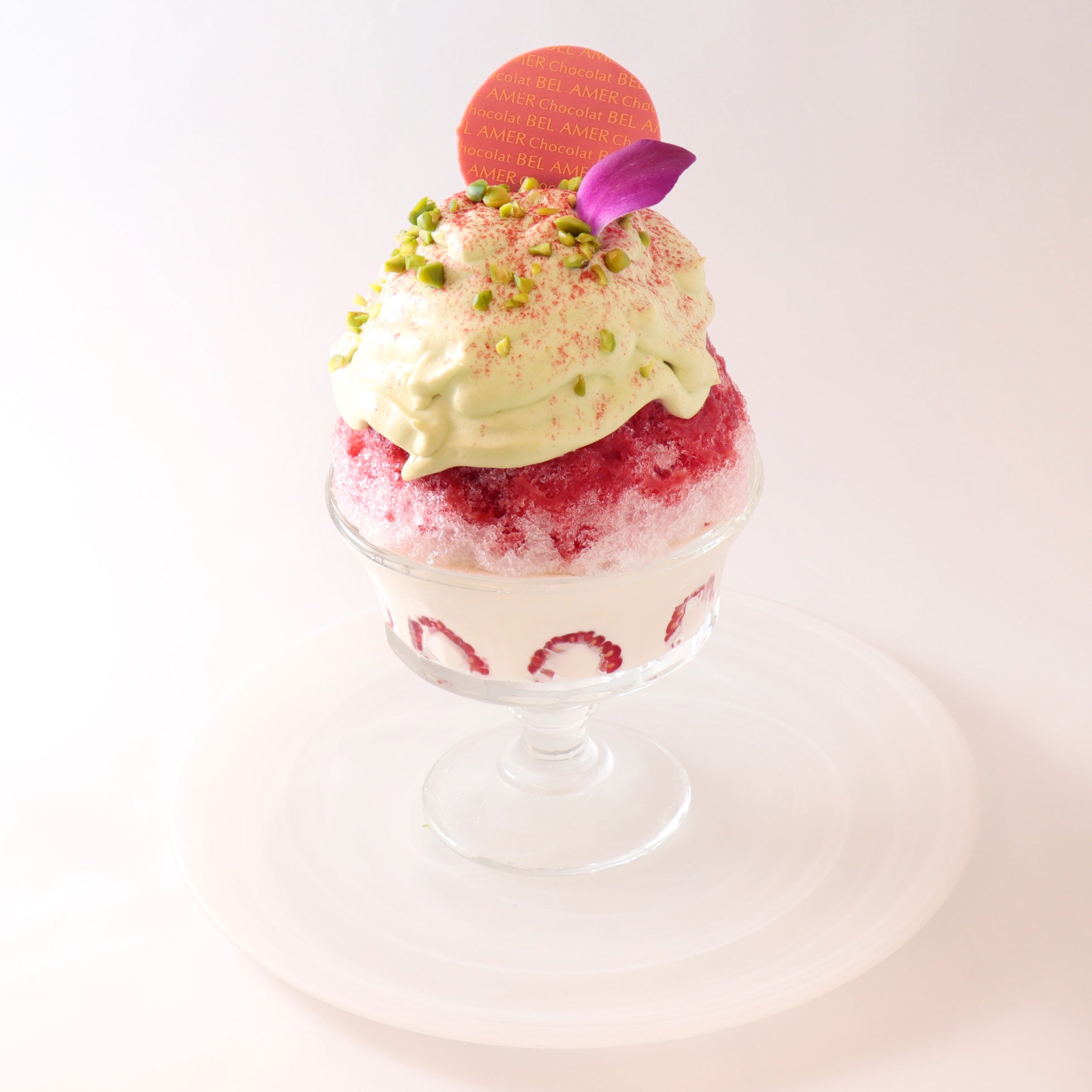 氷の上に甘酸っぱいフランボワーズのシロップとコクのあるホワイトチョコとピスタチオのクリームを重ね、中にはピスタチオのアイス、生クリーム、フランボワーズを詰め込みました。
