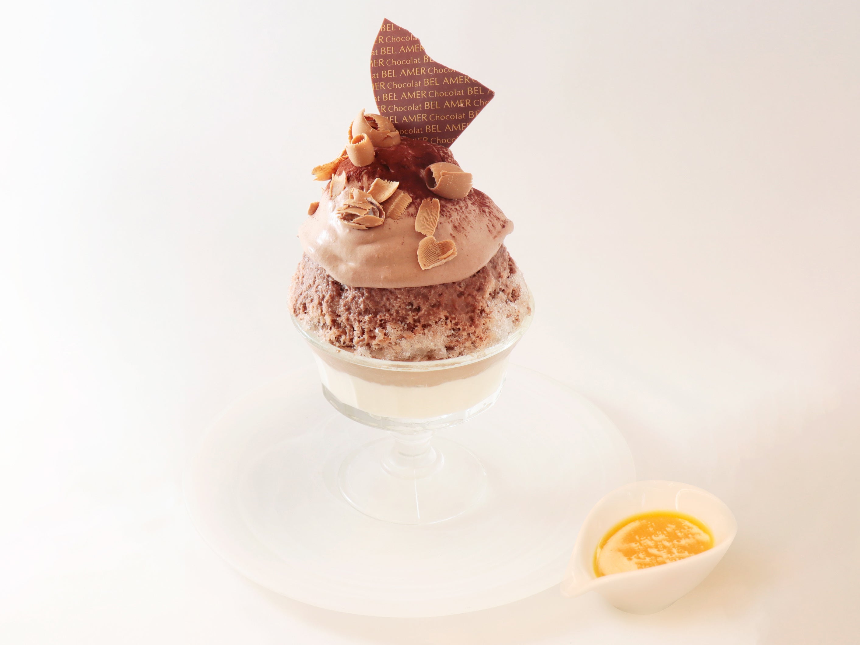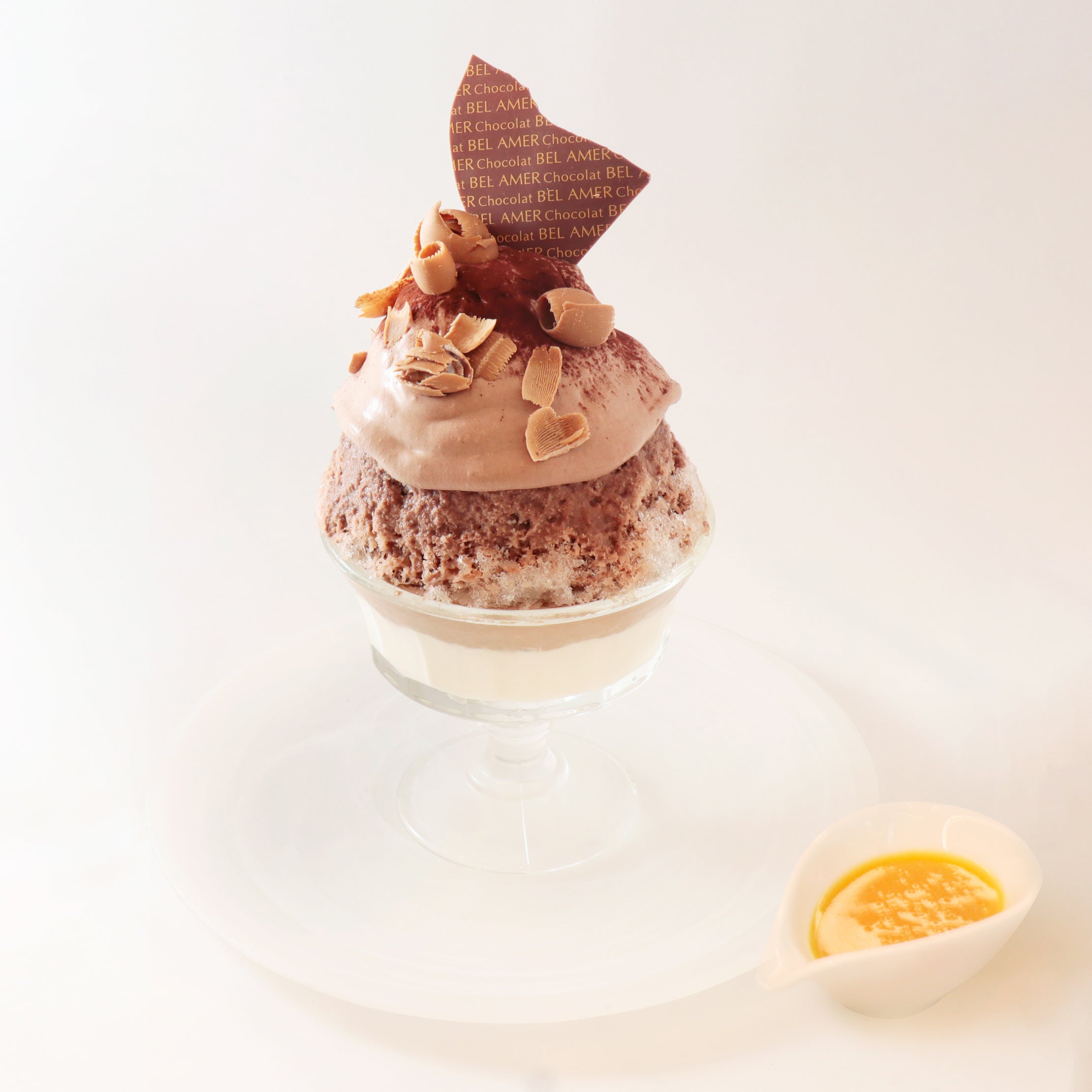 氷の上にベルアメールオリジナルのクーベルチュールを使ったショコラクリームをのせ、中にはショコラアイス、生クリーム、アクセントにオレンジを忍ばせています。