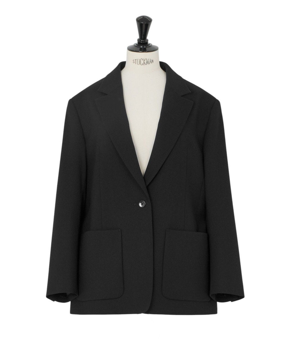 愛知県、尾州産地のテキスタイルメーカーで織り上げたウールジョーゼット素材に、含浸加工で張り感を出した別注素材を使用した、シングルのテーラードジャケット。マスキュリンさを表現する大きめのショルダーと大きめの衿がポイント。
