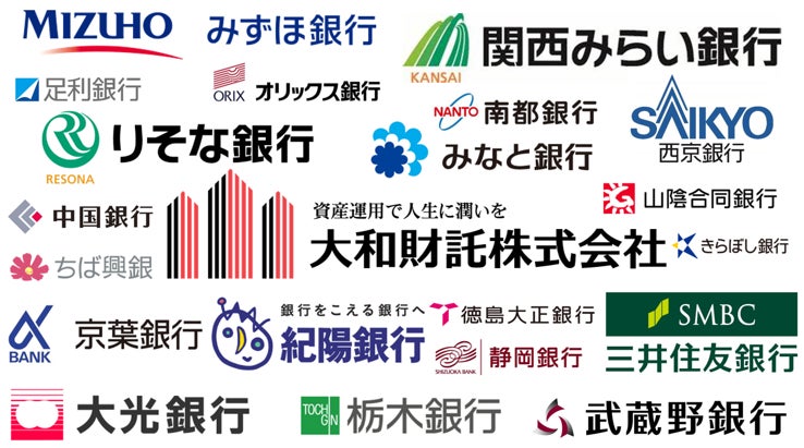 武蔵野銀行・静岡銀行・きらぼし銀行・京葉銀行・千葉興業銀行・西京銀行・大光銀行・足利銀行・栃木銀行・山梨中央銀行・東日本銀行・群馬銀行・第四北越銀行・北日本銀行・東和銀行・東邦銀行・北陸銀行・東京スター銀行・あすか信用組合・大東京信用組合・東京シティ信用金庫・西武信用金庫・飯能信用金庫・城北信用金庫・川口信用金庫・青木信用金庫・埼玉縣信用金庫・ハナ信用組合・横浜幸銀信用組合・湘南信用金庫・新生インベストメント&ファイナンス・NECキャピタルソリューション株式会社