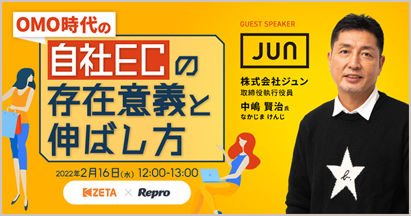 EC商品検索・レビュー・OMOソリューションを開発販売するコマースとCXのリーディングカンパニーであるZETA株式会社(本社:東京都世田谷区、以下ZETA)は、Repro株式会社(本社:東京都渋谷区、以下Repro)と共同で2022年2月16日(水)に「OMO時代、自社ECの存在意義と伸ばし方とは?」と題したオンラインセミナーを開催いたします。