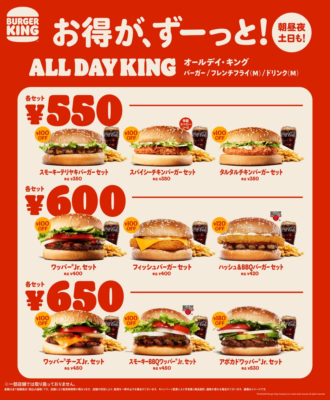 | 平日も休日も朝昼夜、いつでもお得なセットが550円から楽しめる 「キングバリュー」が「オールデイ・キング」にリニューアル! バーガーキング® 自慢のバーガー全9種から選べて、最大180円オフ! |