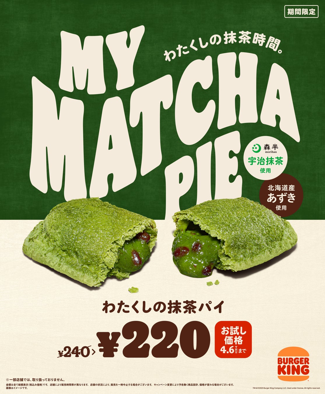 バーガーキング® では大人も楽しめるおいしさをテーマに、「わたくしの」デザートシリーズを展開しております。昨年大好評を博した、創業から180年以上続く京都の老舗お茶ブランド「森半」の宇治抹茶を使用した『わたくしの抹茶パイ』を期間限定で発売いたします。