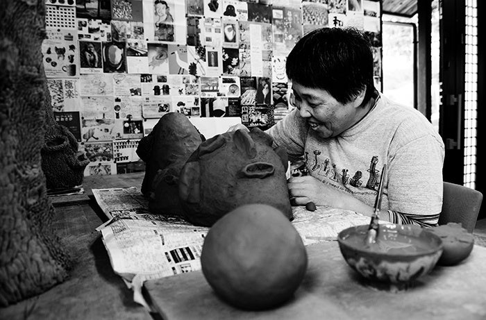 1966年生まれ。滋賀県在住。1985年から『やまなみ工房』に所属。思いを人に伝えるのが苦手な彼女は、コミュニケーションのツールとして振り向いて欲しい人の立体を作り続けている。モデルはすべて思いを寄せる男性。最初に題材を決め、原形を整えると、その表面全てを細かい米粒状の陶土を丹念に埋め込んでいく。完成までに大きな作品では約2か月以上を要する事もあり、無数の粒は作品全体を覆い尽くし様々な形に変化を遂げていく。大好きな人に認めてほしい。今もなお、その思いが彼女の創作に向かう全てである。