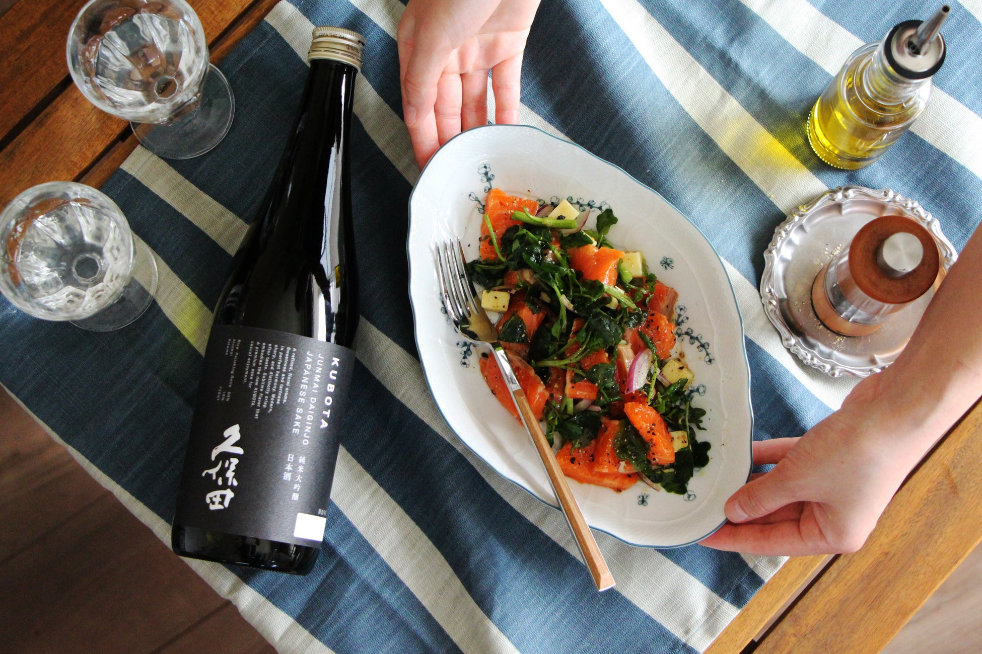 ①サーモンとクレソンのマリネ×久保田 純米大吟醸