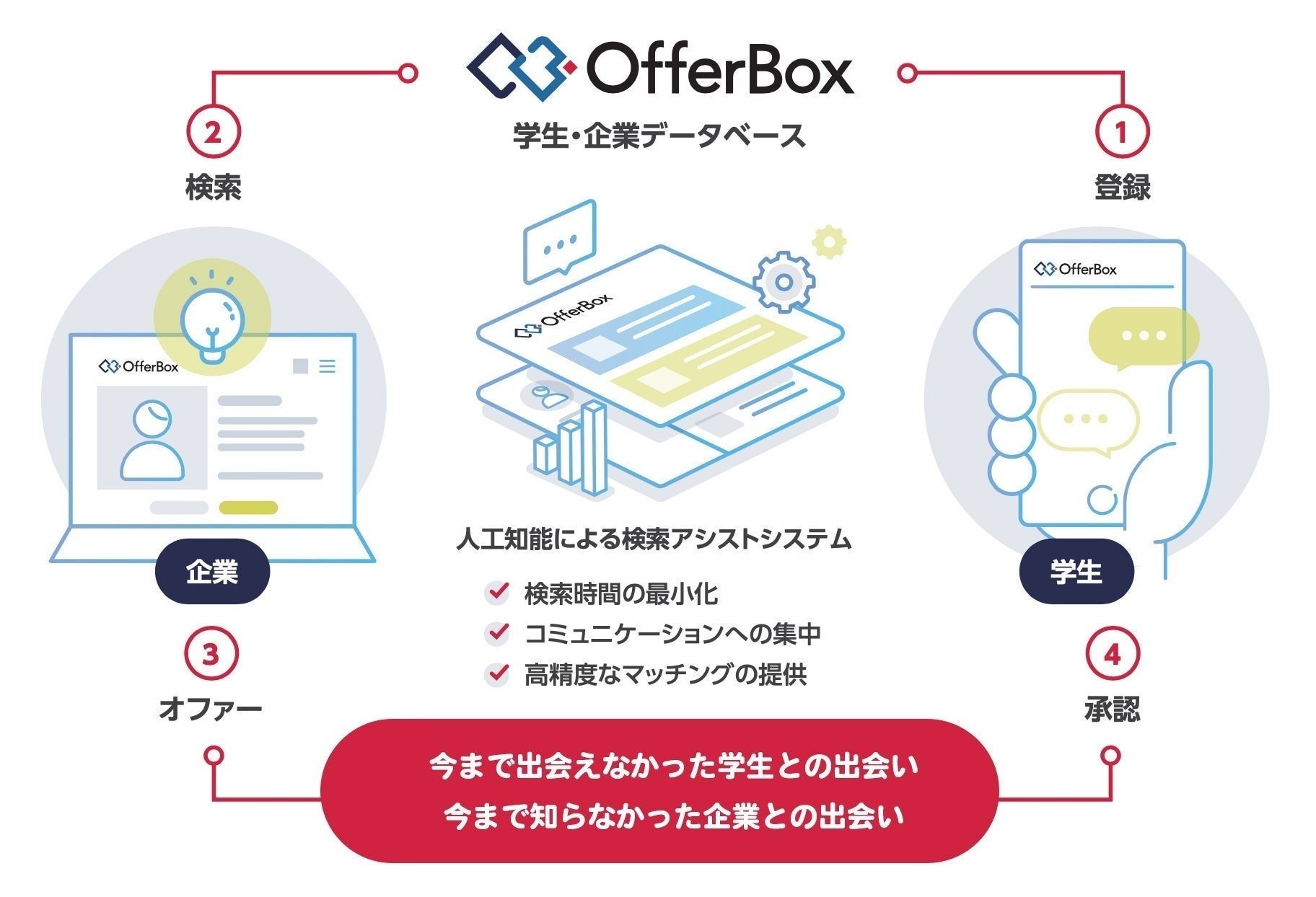 OfferBoxは企業から学生にオファーを送る新卒採用サービスです。企業は「会いたい学生」の情報を検索して効率的にアプローチができます。学生は、知らない企業や業界からのオファーにより自身の可能性を拡げることが可能です。当サービスは、オファー型、逆求人型、ダイレクトリクルーティング、スカウト型サービスなどと呼ばれています。