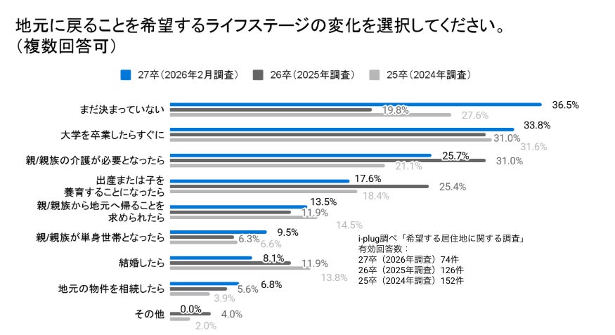 Q2にて「いずれは地元に戻りたい」「すぐにでも戻りたい」と回答した学生にその理由を聞いたところ「親や親戚、実家の近くに住みたいから(44.6%)」が最多でした。一方で、これまで3割近くあった「地元の環境が魅力的だから(21.6%)」という回答は、26卒学生(29.4%)・25卒学生(28.3%)と比較して減少していることがわかります。