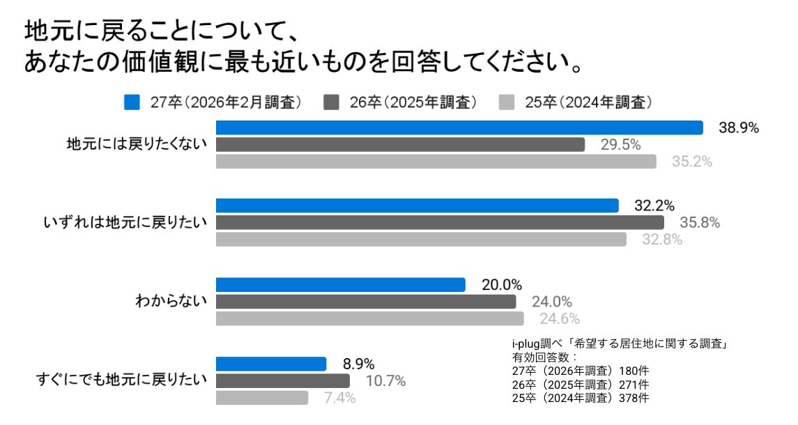 大学進学で地元を離れた27卒学生、38.9%が「地元には戻りたくない」と回答。過去3年で最多〜希望する居住地に関する調査〜
