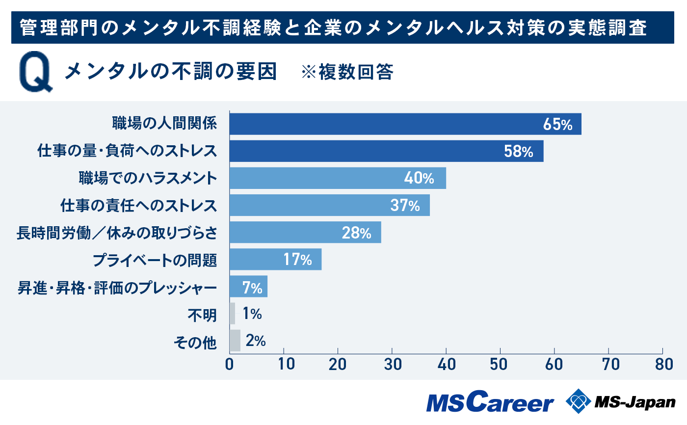 メンタル不調の原因についての調査では、最も多かったのが「職場の人間関係(65%)」、ついで「仕事の量・負荷へのストレス(58%)」「職場でのハラスメント(40%)」と続きました。