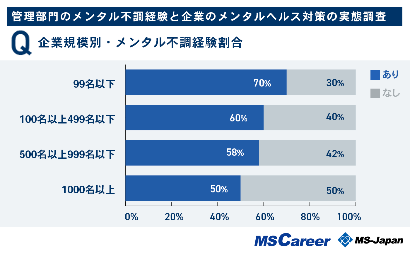 また、メンタル不調経験について所属企業の規模、職種別にみると、企業規模が小さくなるほどメンタル不調は増え、従業員数99名以下の企業に所属する方のメンタル不調経験割合は70%という結果となりました。