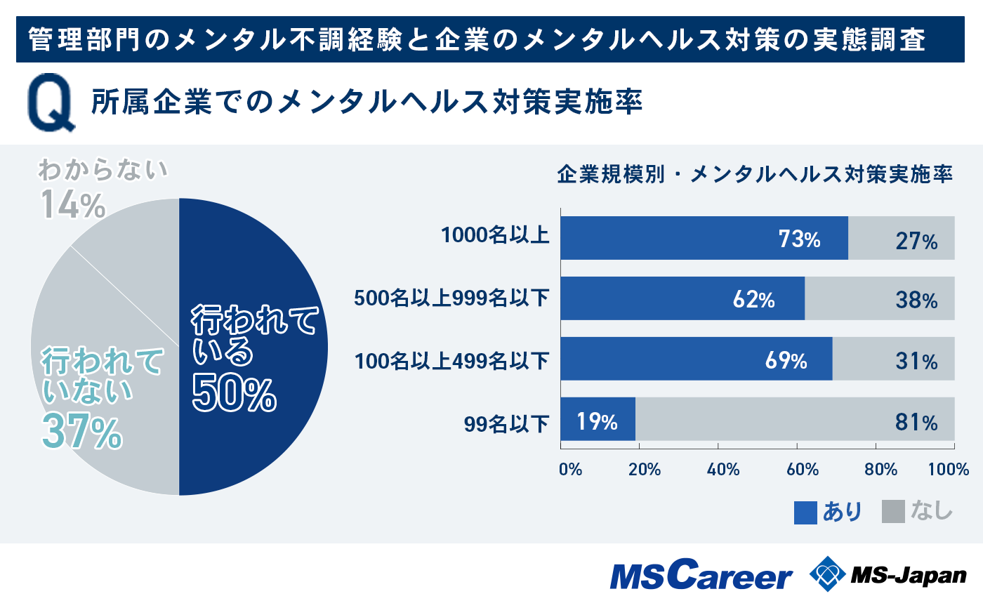 メンタル不調に対する対策を実施している企業は半数で、企業規模によって実施率に大きな差が出ていることがわかりました。特に従業員数99名以下の企業の対策実施率は最も低く19%で、従業員数100名以上の企業の実施率と大きな差がつく結果となりました。