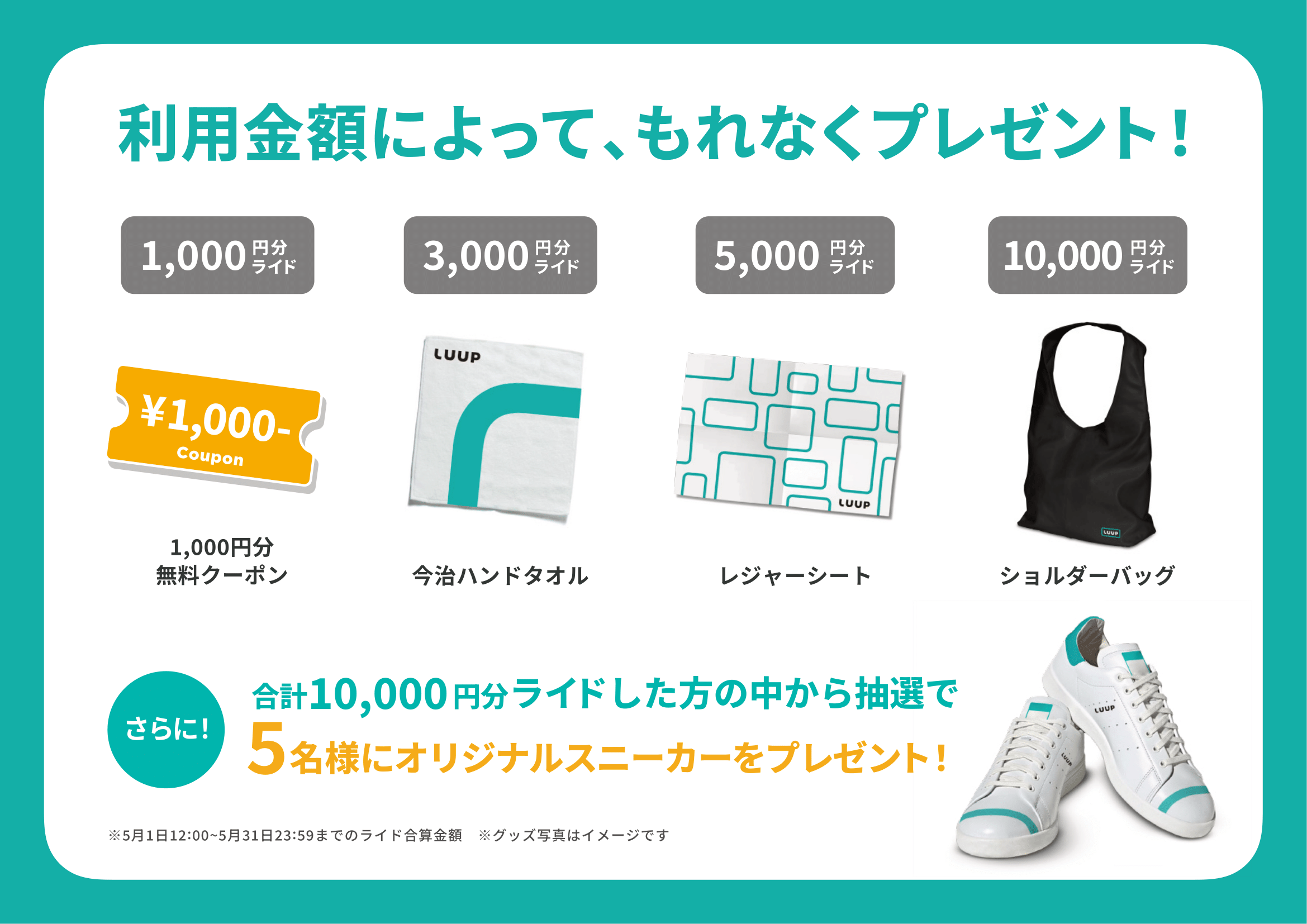 ※条件を達成するごとに全ての商品を受け取ることができます。例えば、合計乗車金額10,000円以上を達成した場合、ショルダーバッグに加えて1,000円分クーポン、LUUPオリジナル今治ハンドタオル、LUUPオリジナルレジャーシートを全て1つずつ受け取ることが可能です。