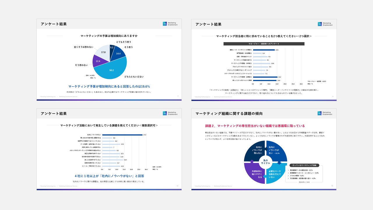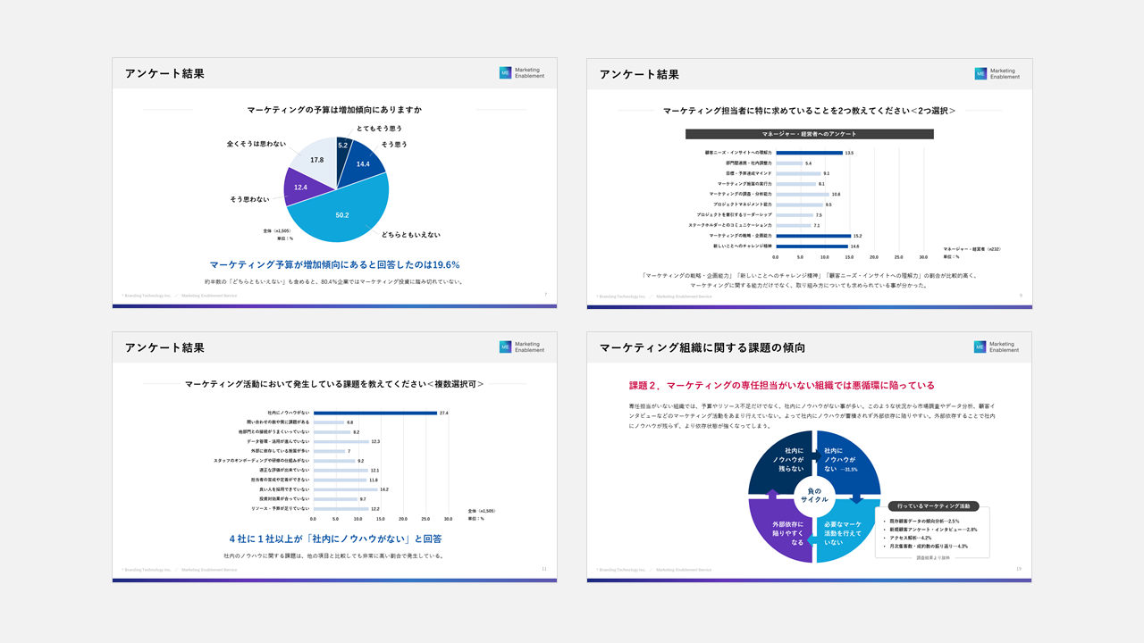 今回の調査では、マーケティング担当者の育成や、組織の立ち上げ・拡大における課題を特定しレポート化しています。是非、本レポートをご自身の組織の課題特定や、マーケティングを強化するためのヒントとしてお役立て下さい。
