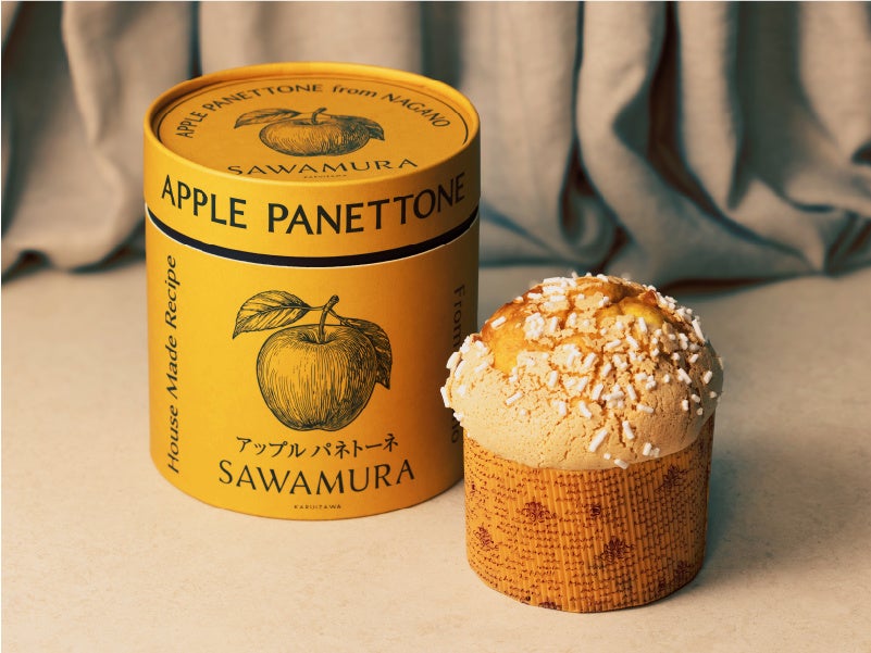 沢村ではふんわりとした生地にりんごのやさしい甘みを閉じ込めた「アップル パネトーネ」をご用意。口に運ぶたびに広がる果実の香りとほのかな発酵の風味、上品で軽やかな味わいは、冬のティータイムや贈りものにもぴったりな一品です。このパネトーネのためだけに作られた、オリジナルパッケージに入れてお届けいたします。