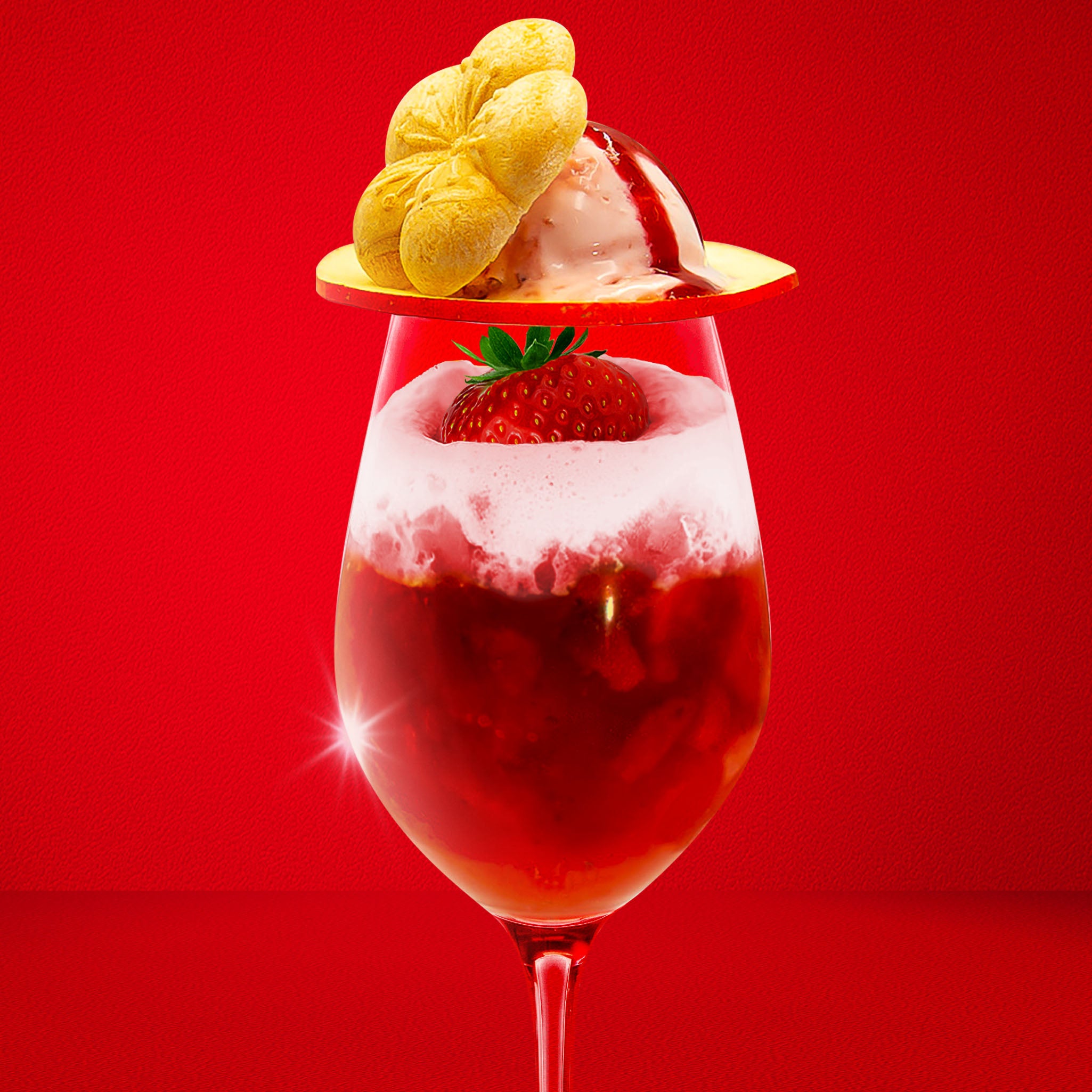 梅酒カクテルクリームソーダ 宝石いちごは、完熟梅のシロップと南高梅のベースに、イチゴのシロップと刻みイチゴを加え、クリーミーなヨーグルトエスプーマを重ね、その上にやさしく大粒のイチゴを丸ごと1粒乗せました。大切なイチゴを覆う様にリンゴスライスで蓋をし、イチゴのアイスクリームに梅イチゴシロップをかけ、梅最中を1枚乗せました。
