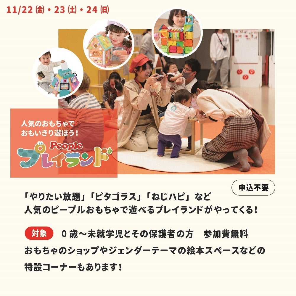 その他、予約不要でピープルのおもちゃを体験できる「ピープルプレイランド」がこども図書館に3日間オープン!一部商品はその場で販売もしますので、クリスマスプレゼントの準備にもおすすめです。