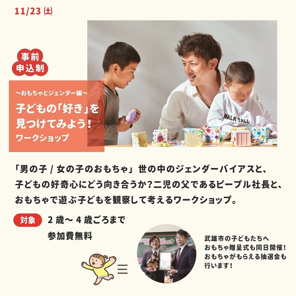 ピープル株式会社が子育て環境PR大使を務める佐賀県武雄市にて、九州地方で初開催「赤ちゃんをあじわうワークショップ」等、子どもたちが好奇心のままに楽しめるイベントを11月22(金)~24(日)に開催。