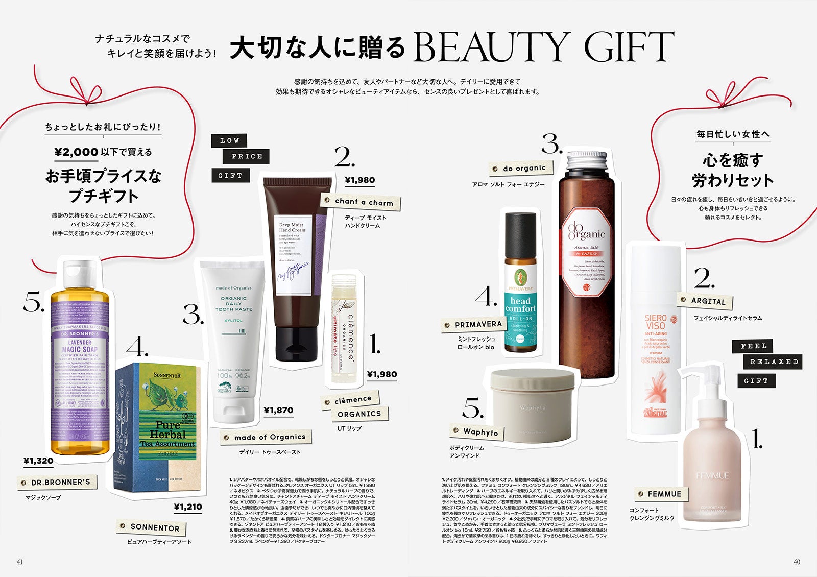またこの時期ならではの「ギフト」特集では、大切な人に贈りたいビューティギフトをTPO別にご紹介。