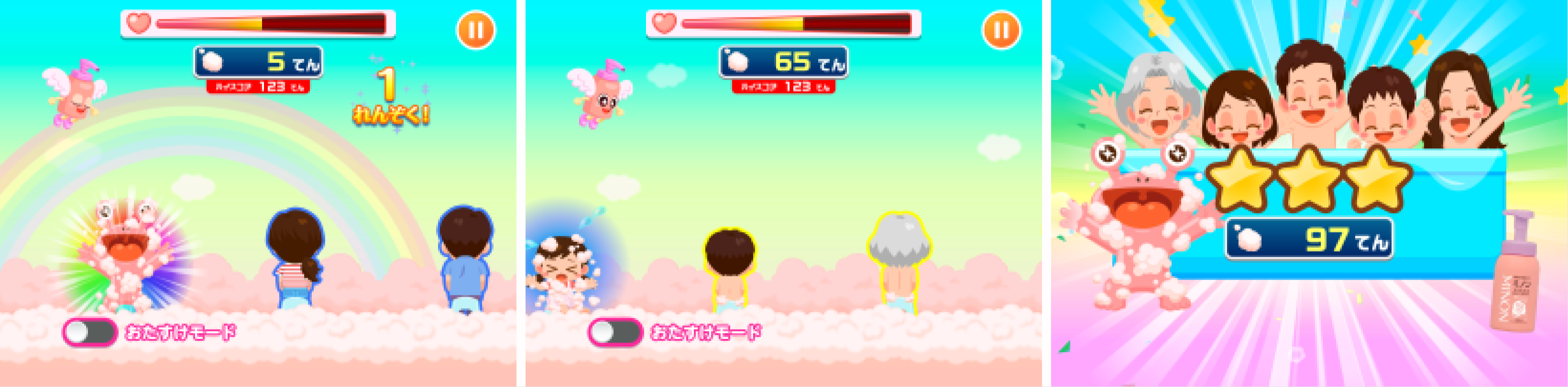 「ミノンてんし」をタップして、家族みんなに泡を届けるゲームです。時々登場する宇宙人キャラクターに泡を届けるとスコアが大幅にアップします。服を着ているキャラクターに泡を落としてしまうと減点されます。泡を届けた数に応じてスコアが表示されます。
