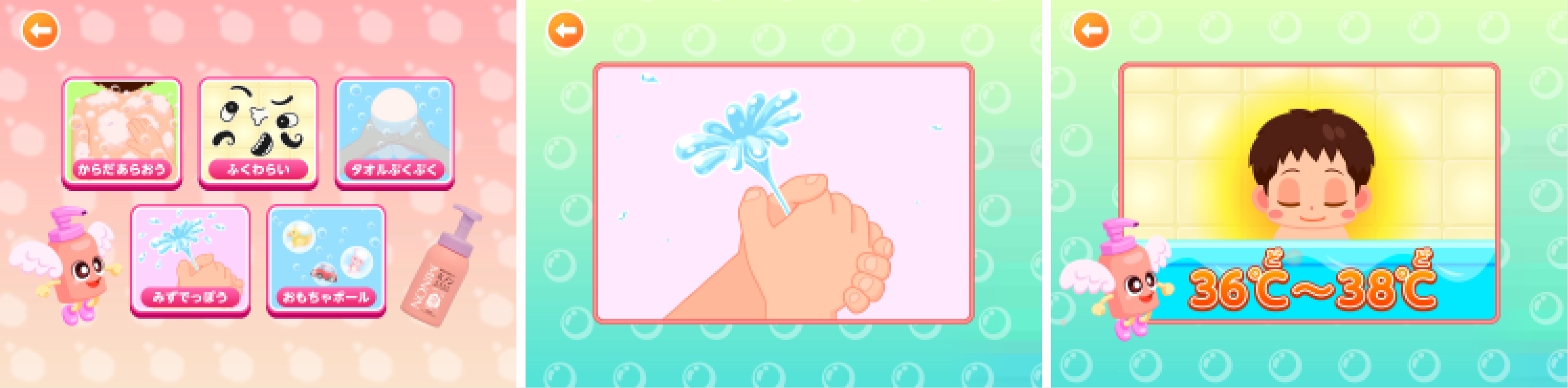 本ゲームは、「おふろでやってみよう」と「ミノンてんしのあわをとどけよう」で構成され、正しくからだを洗うことの大切さやお風呂での楽しい遊び方について知ることができます。