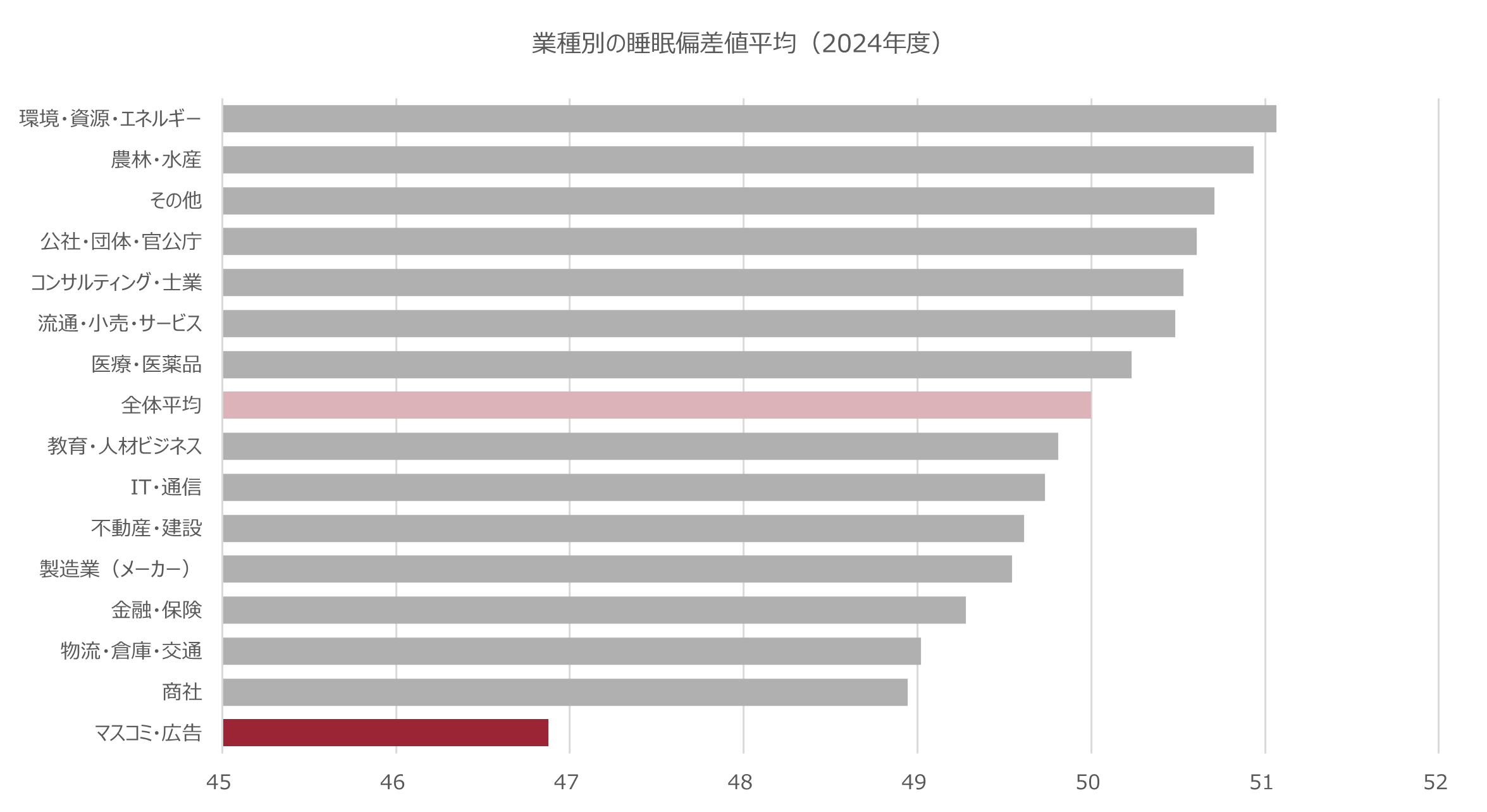 ブレインスリープは、日本人の睡眠の実態を可視化することを目的に、2020年より毎年、全国47都道府県の有職者1万人(性別・年齢・都道府県で割付)を対象に、睡眠に関する自覚症状や睡眠習慣を含む幅広い視点で睡眠の主観的評価を定量化する睡眠調査「睡眠偏差値®️調査」を実施しています。本調査において、有職者1万人を業種別に分類した際、<マスコミ・広告>は2020年の初回調査以降継続して、睡眠偏差値のスコアが他業種と比較した際に低い傾向にあり、直近発表した2024年の調査においても、全業種のうち最下位という結果が明らかになっています。「睡眠偏差値®️調査」のスコアは、様々な角度から睡眠状態を可視化し、数値を出していますが、睡眠の質においても、特に<マスコミ・広告>業種の方々は、「睡眠の質」が低い傾向となっています。