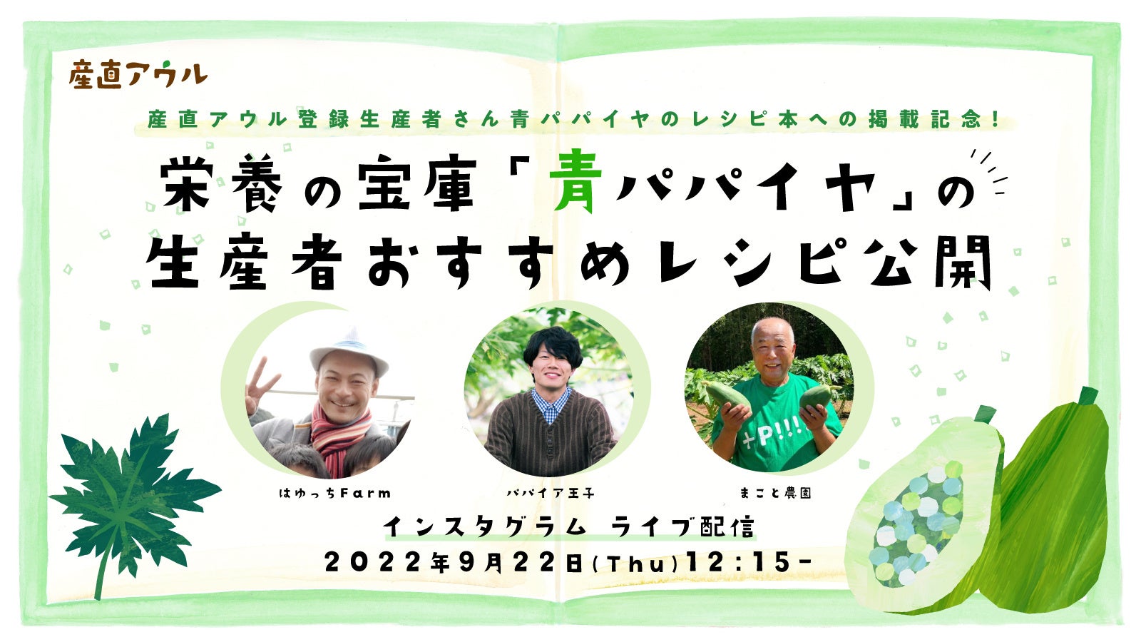 今回のインスタライブは、産直アウルで青パパイヤを出品している登録生産者「はゆっちFarm」、「パパイヤ王子」、「まこと農園」がレシピ本「青パパイヤのレシピ 酵素のパワーで元気になる!(池田書店)」に掲載されたことを記念して、「青パパイヤ」をテーマに配信いたします。