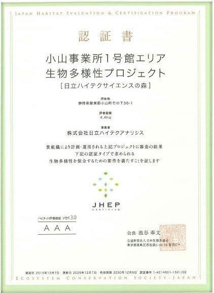 株式会社日立ハイテク(以下、日立ハイテク、株式会社日立製作所のコネクティブインダストリーズ(CI)セクター所属)のグループ会社である株式会社日立ハイテクアナリシス(以下、日立ハイテクアナリシス)富士小山事業所(静岡県駿東郡)内に整備した「日立ハイテクサイエンスの森」が、JHEP認証*1において、前回に続いて最高ランクのAAA(トリプルエー)を取得しました。