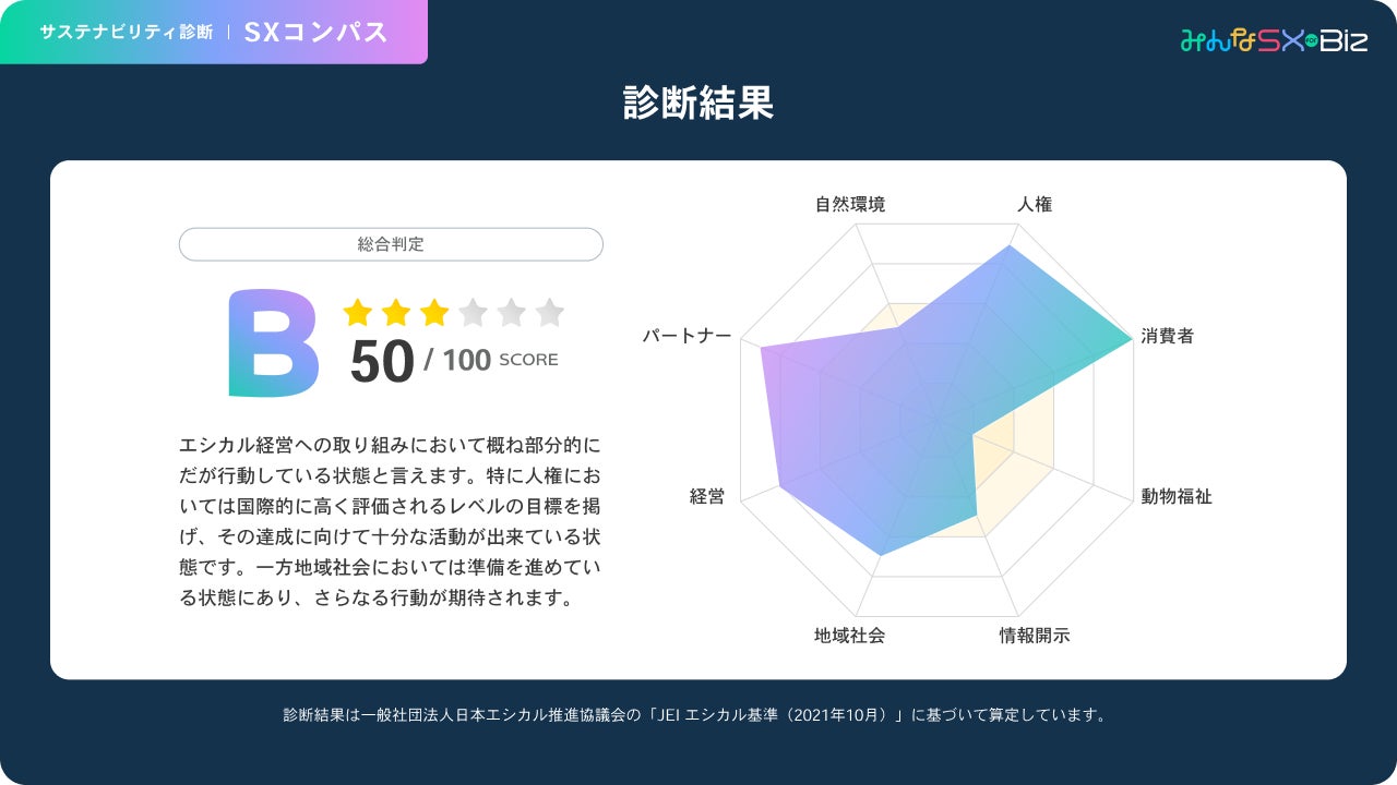 サステナビリティの包括的基準「JEIエシカル基準」に準拠した43項目の質問、中小企業の競争力強化につながるアクション実行をサポート