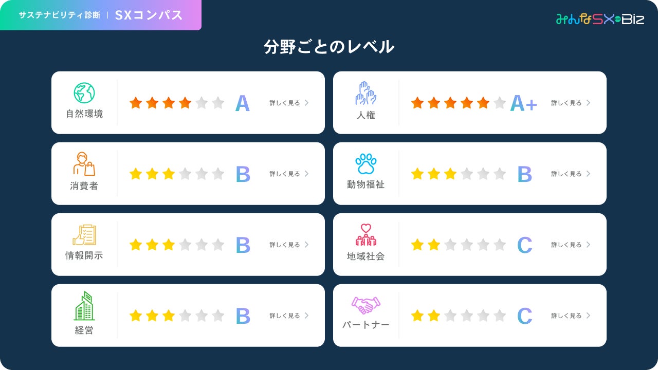 社会の仕組みをサステナブルにアップデートする事業を展開する株式会社UPDATER(所在地:東京都世田谷区、代表取締役:大石英司)は、企業のサステナビリティ推進に役立つコンテンツやマッチングの場を提供する「みんなSX for Biz」において、サステナビリティ診断の「SXコンパス」をリリースいたします。「SXコンパス」は、8つの分野、43項目の質問によって自社のサステナビリティへの対応状況を見える化し、必要なアクションを提示するツールで、特にこれからサステナビリティを推進していく中小企業の方向けのサービスです。本ツールは、⼀般社団法人日本エシカル推進協議会による「JEI エシカル基準」に準拠しています。「みんなSX for Biz」への会員登録をしていただくことで、無料でご利用いただけます。