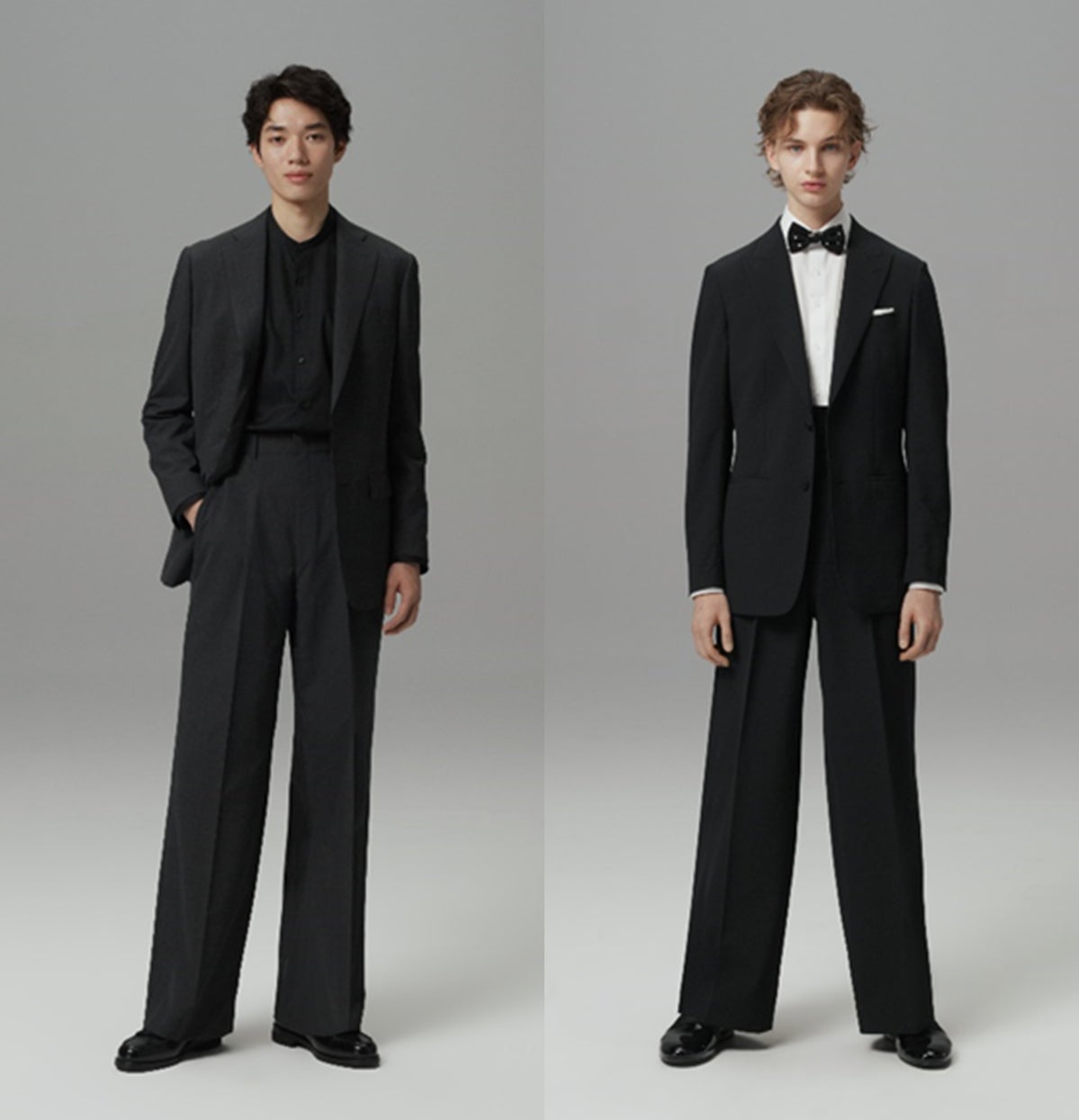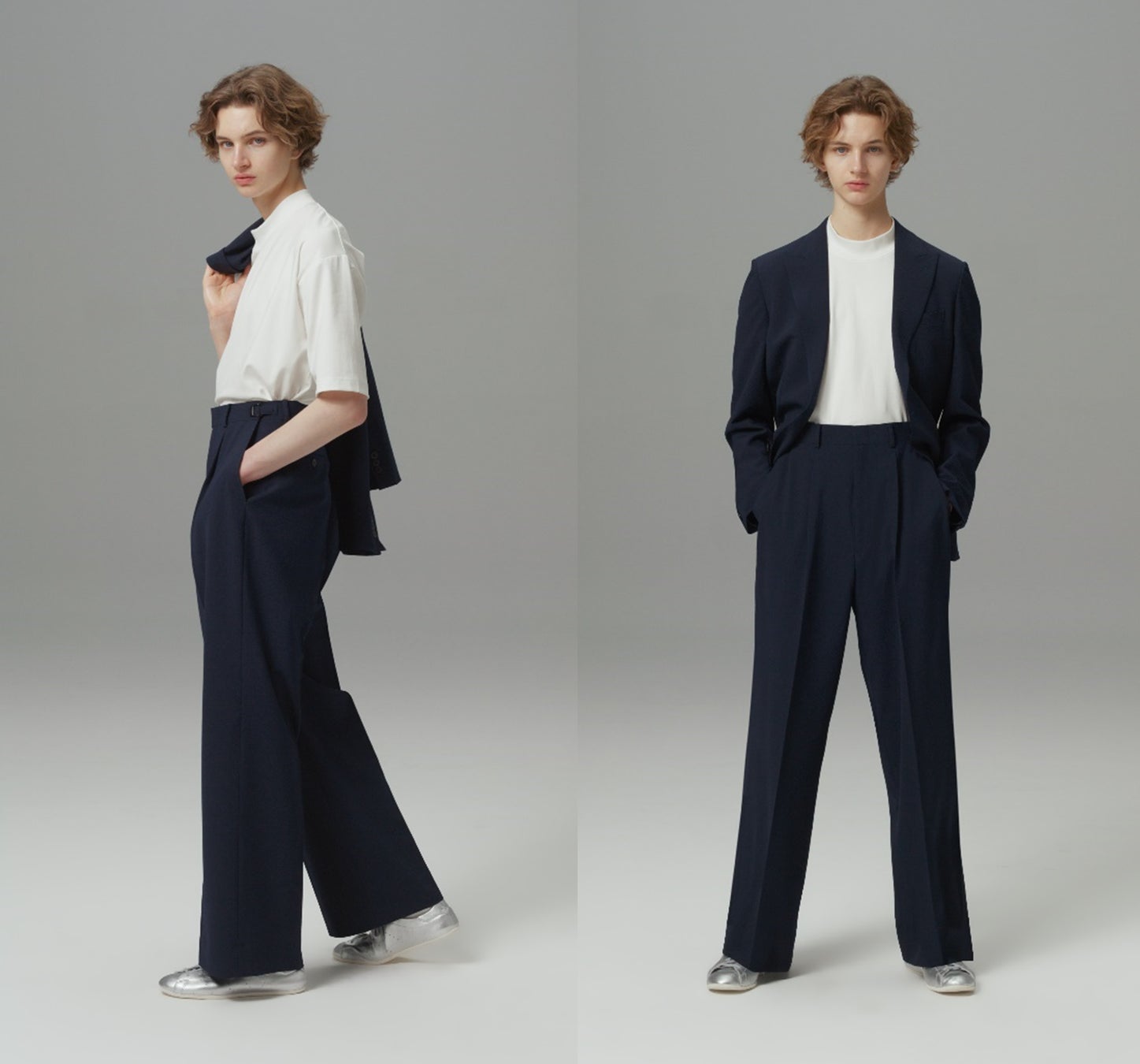 春夏モデルでも、「ワイドパンツスーツ」の完成されたシルエットは変えず、生地の軽量化や裏地仕様の見直しにより、見た目の構築美と着用時の軽やかさの両立を実現しました。ジャケットは主役である「ワイドパンツ」を際立たせるために直線的なフロントカットを基調にしつつ、裾にはわずかな丸みを持たせることで絶妙なバランスを形成しています。