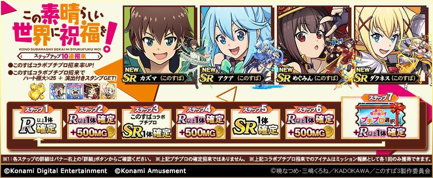 ステップアップ10連招来は、「このすばコラボプチプロ」を入手できるだけでなく、さまざまなボーナスがついてきます。ステップ3まで引くと、「このすばコラボプチプロ」を1体確定でゲットできます。さらにステップ7まで引くと、好きなコラボプチプロを入手できる「この素晴らしい世界に祝福を!プチプロ選択交換券」をゲットできます!