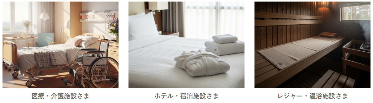 安定品質の洗濯と選べる機器・プランで、ホテルや旅館などの宿泊施設のほか、福祉施設やレジャー・温浴施設など、業務用洗濯の悩みごと解決とコストカットを同時に実現しています。
