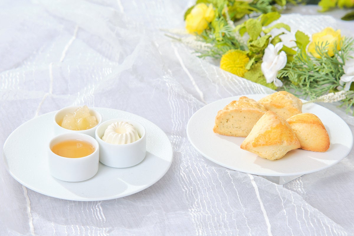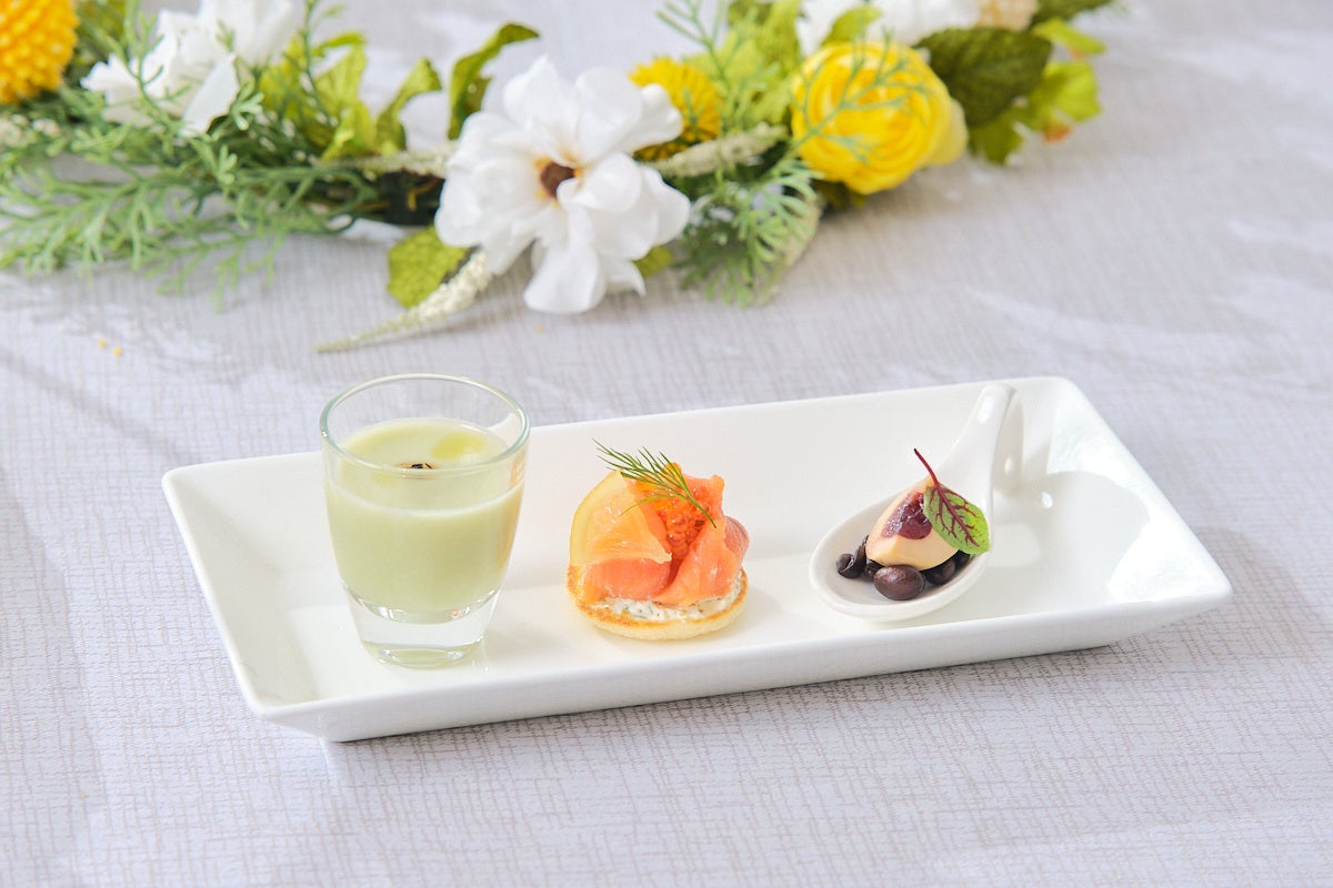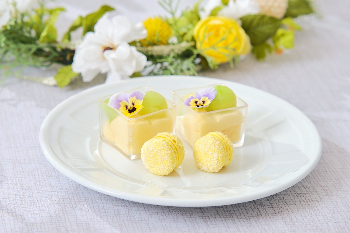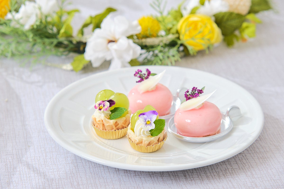 スイーツは、みずみずしいシャインマスカットを使用したタルトや、白桃の果実とジュレをアーモンドのブランマンジェに重ねて仕上げた優美なひんやりスイーツ、フレッシュメロンの贅沢トライフル、レモンバタークリームとレモンガナッシュをサンドした爽やかなガトーオペラ、薔薇の風味を効かせた桃とラズベリーのムースなど初夏を感じられる色合いと味わいが調和した6種をご堪能いただけます。特製セイボリーにはスモークサーモンとフレンチキャビアのブリニ、フォアグラテリーヌとイチジクコンポートのパンペルデュや、春菊とじゃがいものムースリータバゲット添えの3種をご用意しています。