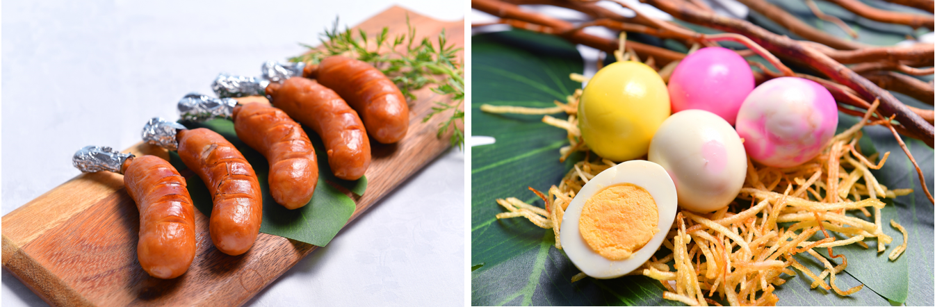 [温製料理]骨付きフランクフルト、パワーステーキ、若鳥手羽先の黄金(ジパング)焼き、ポークバックリブのBBQ風、恐竜ゆで卵など