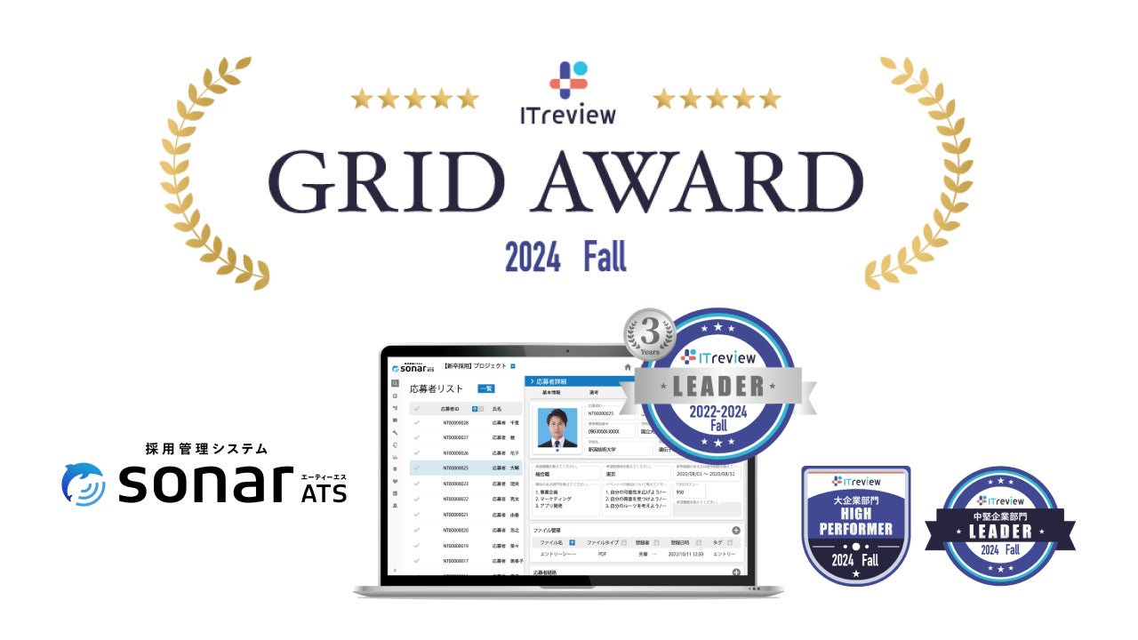 Thinkings株式会社(本社:東京都中央区、代表取締役社長:吉田 崇、以下:当社)が提供する採用管理システム「sonar ATS( https://hr.sonar-ats.jp/itreview_2024fall )」は、アイティクラウド株式会社(東京都港区、代表取締役社長 兼 CEO:黒野 源太)主催の「ITreview Grid Award 2024 Fall」において、採用管理システム(ATS)部門で3年連続「Leader」を受賞しました。また、大企業部門の「High Performer」および中堅企業部門の「Leader」も受賞しました。これまでに、90件以上のレビューを頂いており(2024/10/16 時点)、認知度と顧客満足度の双方が優れた製品として評価されました。