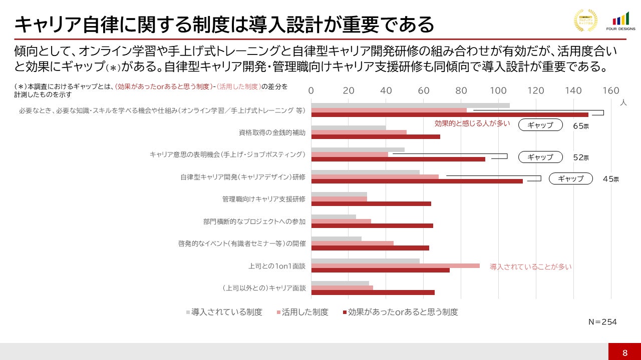 ・オンライン学習や手上げ式トレーニングが効果的と感じる人が多いが、実際には上司との1on1がキャリア自律制度として多く利用されている。