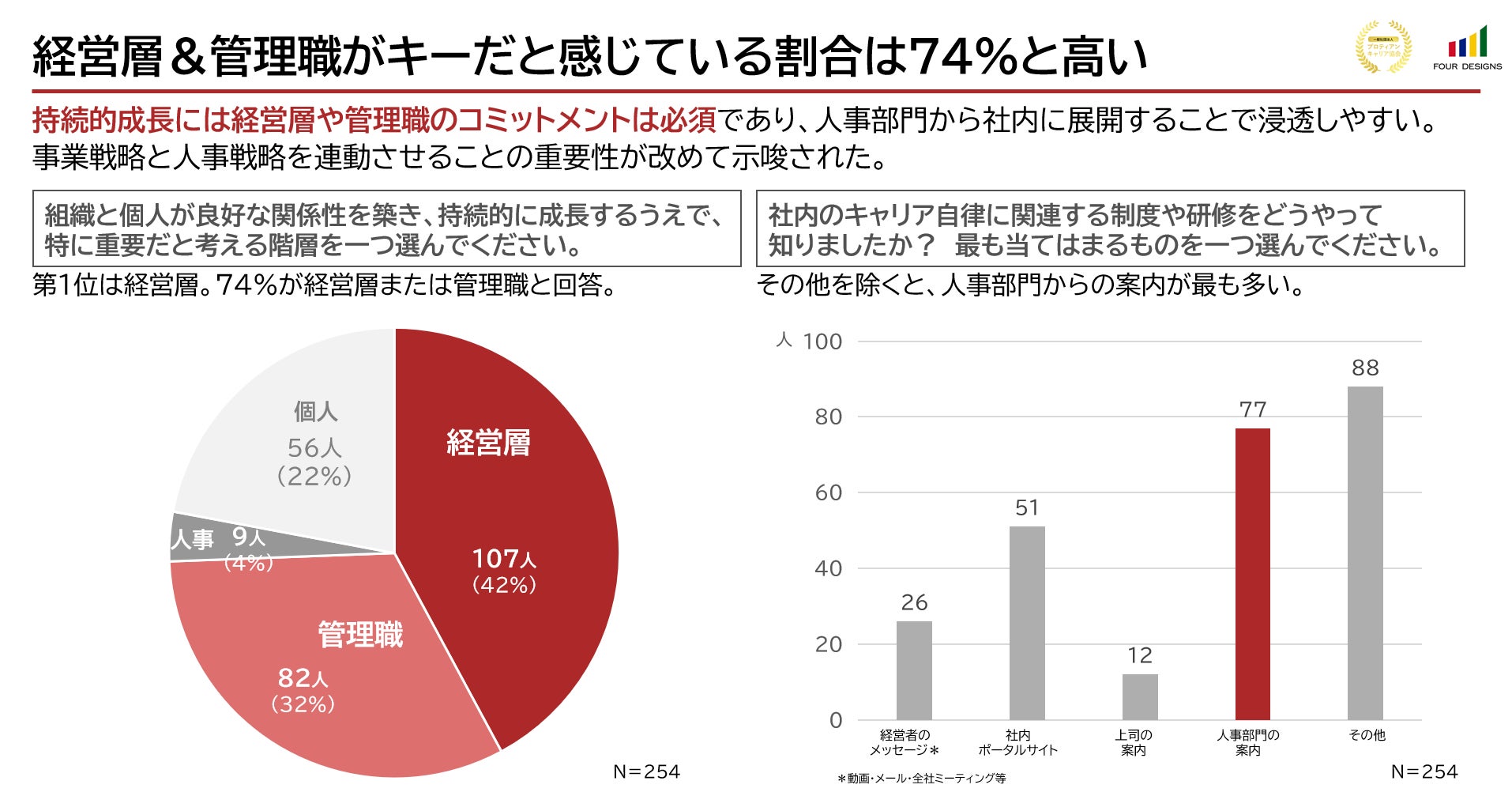 ・74%がキャリア自律の実現のために、経営層と管理職のコミットメントが必要と考えている。人事部門が橋渡し役となり、ビジネス目標と人材育成・活用の方針を一致させることが重要。