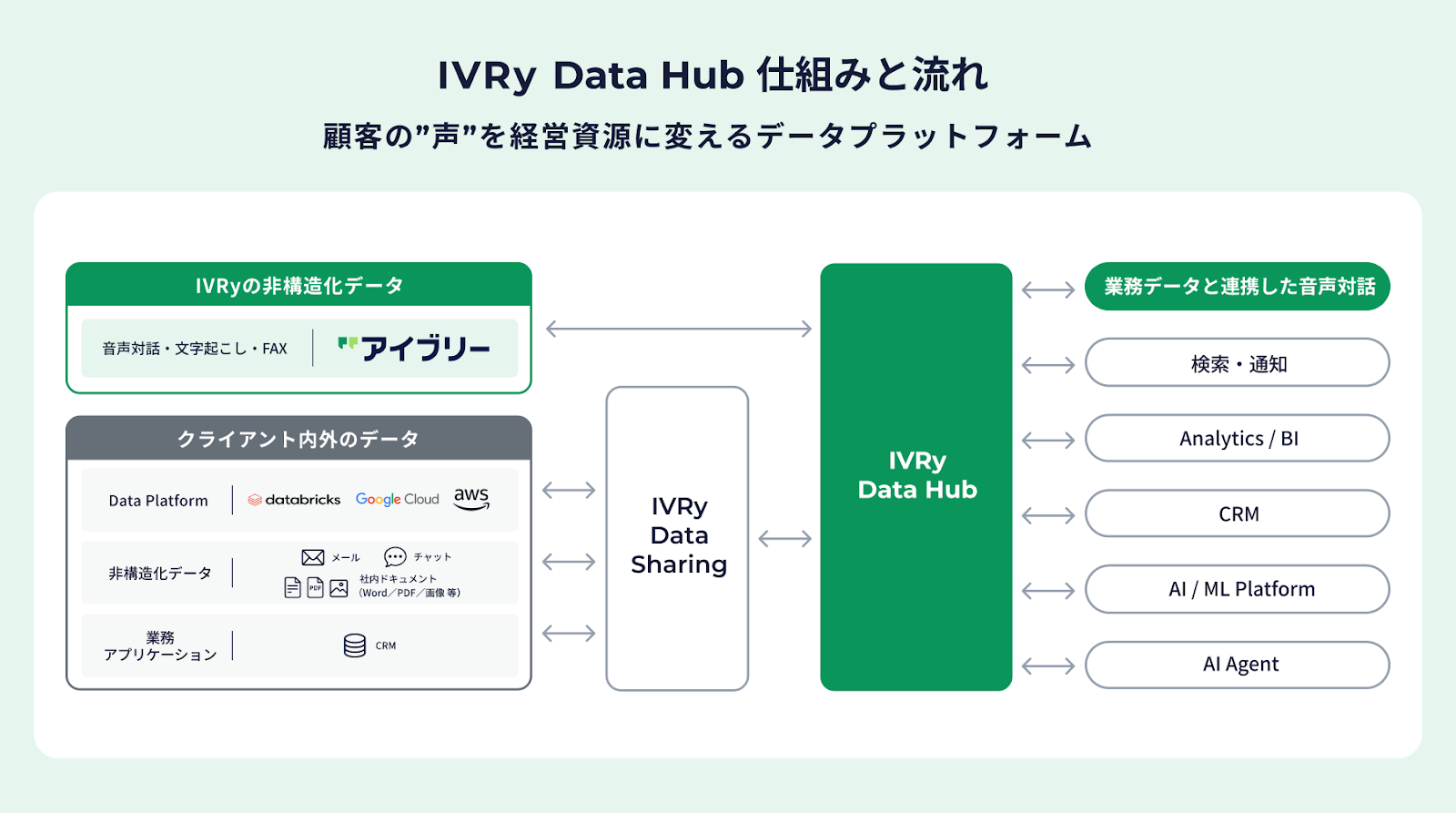 株式会社IVRy(本社:東京都港区、代表取締役/CEO:奥西 亮賀、以下「当社」)が開発・提供する対話型音声AI SaaS「アイブリー」は、企業内に蓄積される通話・メールなどのコミュニケーションデータを一元的に統合・解析するデータプラットフォーム「IVRy Data Hub(アイブリーデータハブ)」の提供を開始します。本プラットフォームでは、企業が保有するコミュニケーションデータ(通話、メールなど)を一元的に統合・分析し、AIの力で経営課題の解決を支援します。
