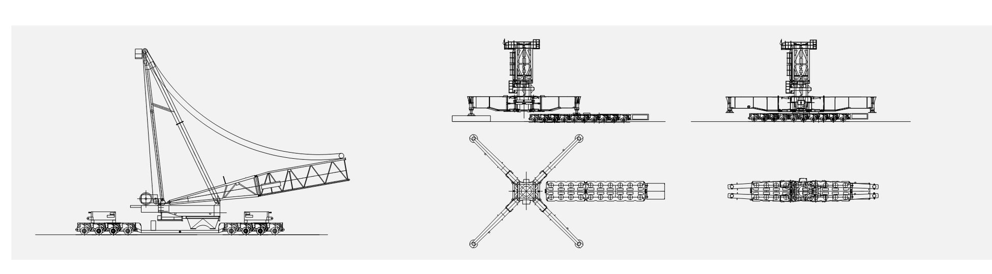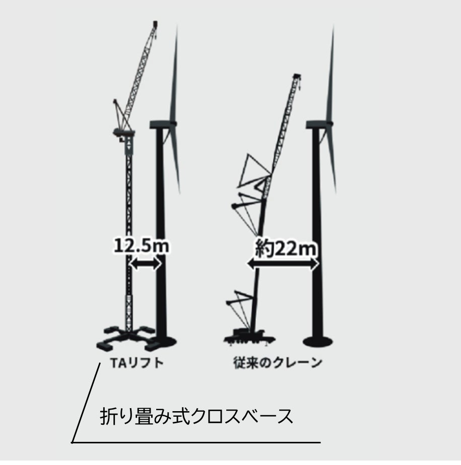 従来のオールテレーンクレーン(※1)の最小作業半径は約22m程度ですが、風車建設用タワークレーン「JCW1250」は、12.5mでの作業半径が標準となるため、サイト面積(※2)を削減することができます。また、折り畳み式クロスベース(※3)を採用し、基礎工事が不要となることに加え、風車間移動の際にはクロスベースを分解せずに輸送できる構造となっております。最大吊能力は95トン、最大作業高さは130mとなり、これまでの国内最高風車よりも高く吊り上げが可能となります。