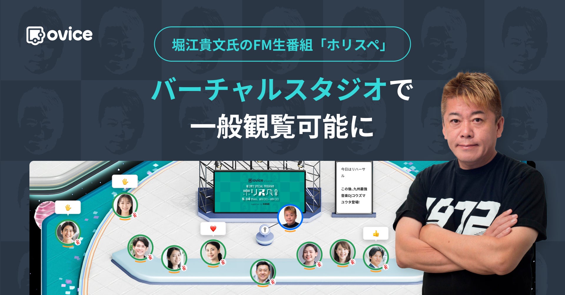 oVice株式会社(本社:石川県七尾市、代表取締役CEO:ジョン・セーヒョン)は、株式会社CROSS FM(本社:福岡県北九州市、代表取締役会長:堀江貴文)が2024年5月14日(火)13~19時に放送する特別番組「ovice presents 堀江貴文 Special Program ホリスペ!supported by カーサプロジェクト」において、リスナーが自由に収録を観覧できるバーチャルスタジオとして「ovice(オヴィス)」が利用されることをお知らせします。バーチャルスタジオ内では、アバターとなって他のリスナーの方たちと一緒にラジオの生放送を聴くことができるため、実際にみんなで収録スタジオを観覧しているような臨場感を味わうことができます。
