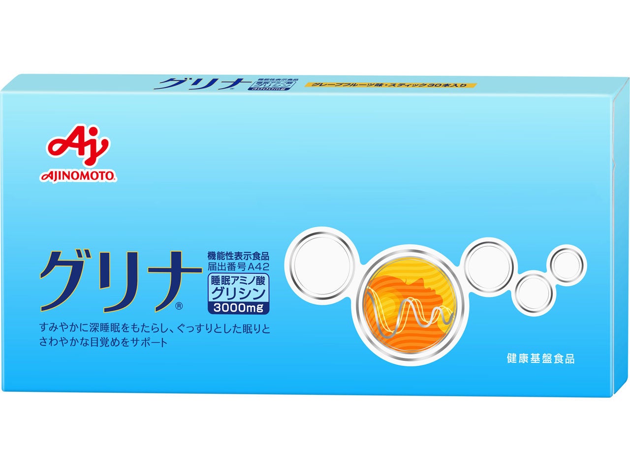 睡眠ケアに役立つグリシンとストレスケアに役立つGABAというWのアミノ酸を配合したサプリメント/ドリンクです。グリシン3.0gとGABA100mgを配合しています(①スティック1本・②1缶あたり)。「グリナ®」睡眠ケア&ストレスケアはレモン味、「グリナ®」睡眠ケア&ストレスケア<ドリンクタイプ>はアップル味です。