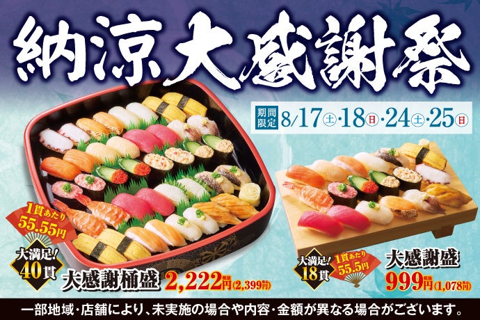 日頃のお客様のご愛顧に感謝の気持ちを込めて、ボリューム満点で好きなネタが盛りだくさん!『納涼大感謝祭』を開催いたします!!大変お買い得です!